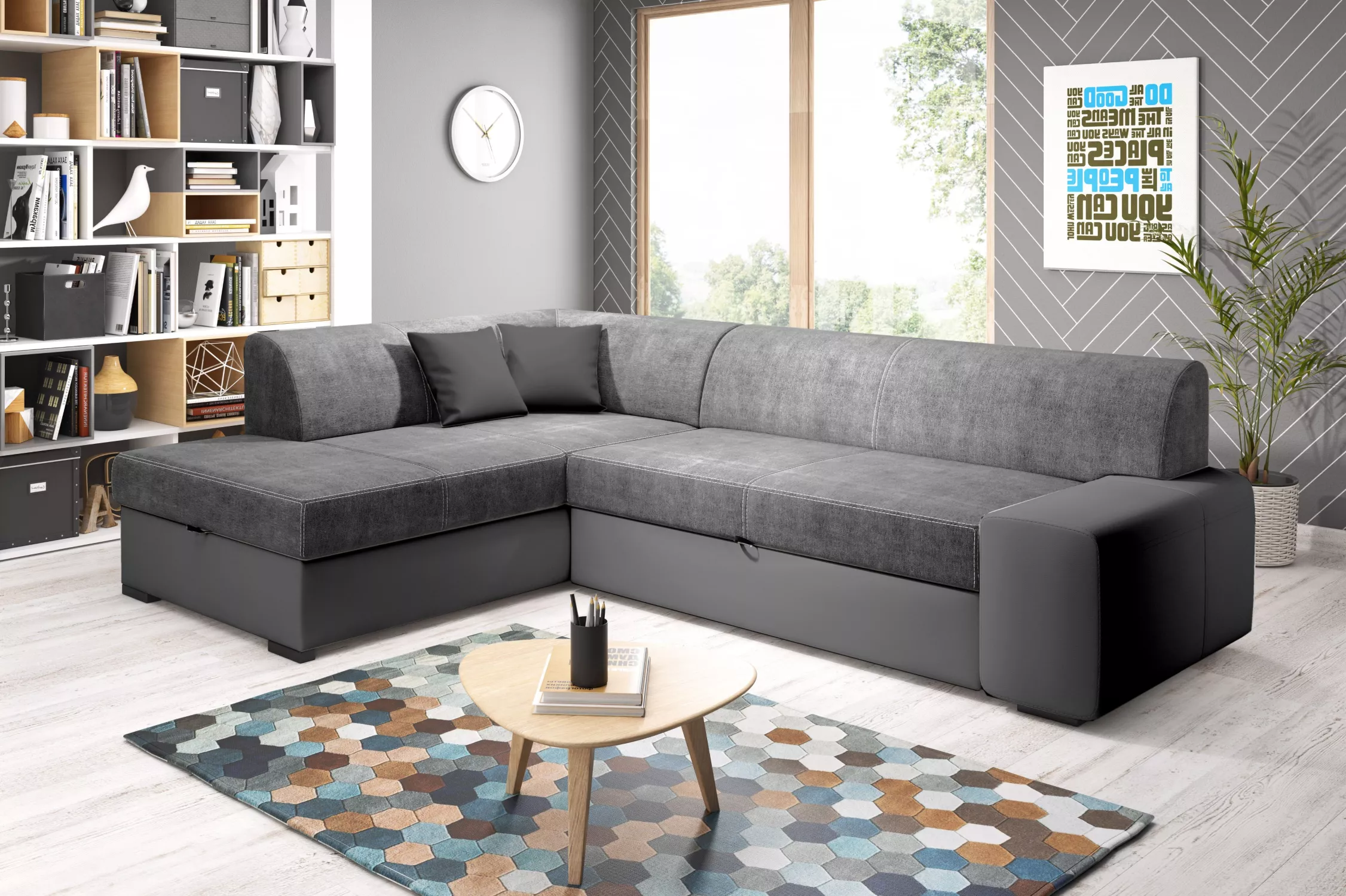 Rohová sedací souprava VALTRUDA díky svým rozměrům a zpracování skvěle zapadne i do menšího obývacího pokoje. Sedačka disponuje rozkládací funkcí na lůžko o rozměrech 135x195 cm a úložným prostorem.