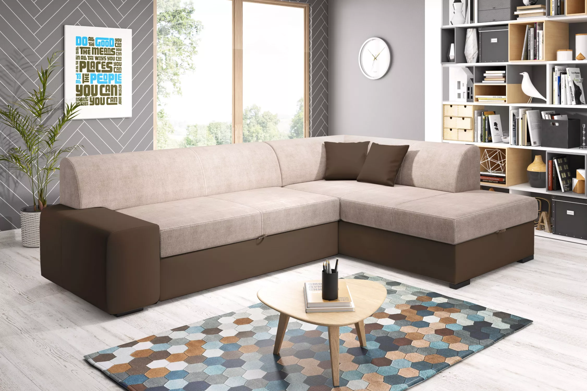 Rohová sedací souprava VALTRUDA díky svým rozměrům a zpracování skvěle zapadne i do menšího obývacího pokoje. Sedačka disponuje rozkládací funkcí na lůžko o rozměrech 135x195 cm a úložným prostorem.