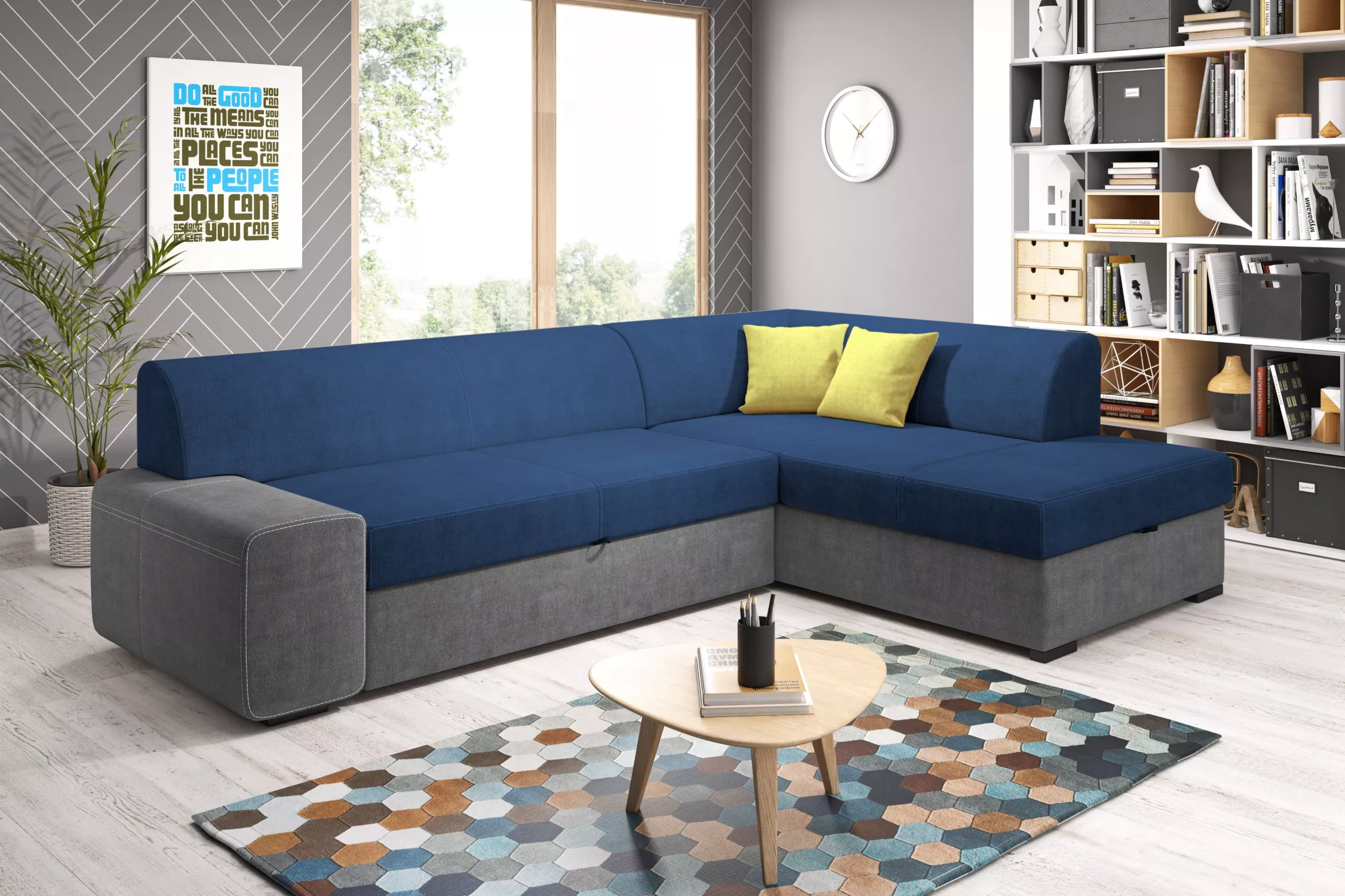 Rohová sedací souprava VALTRUDA - modrá / tmavě šedá / žlutá, pravý roh