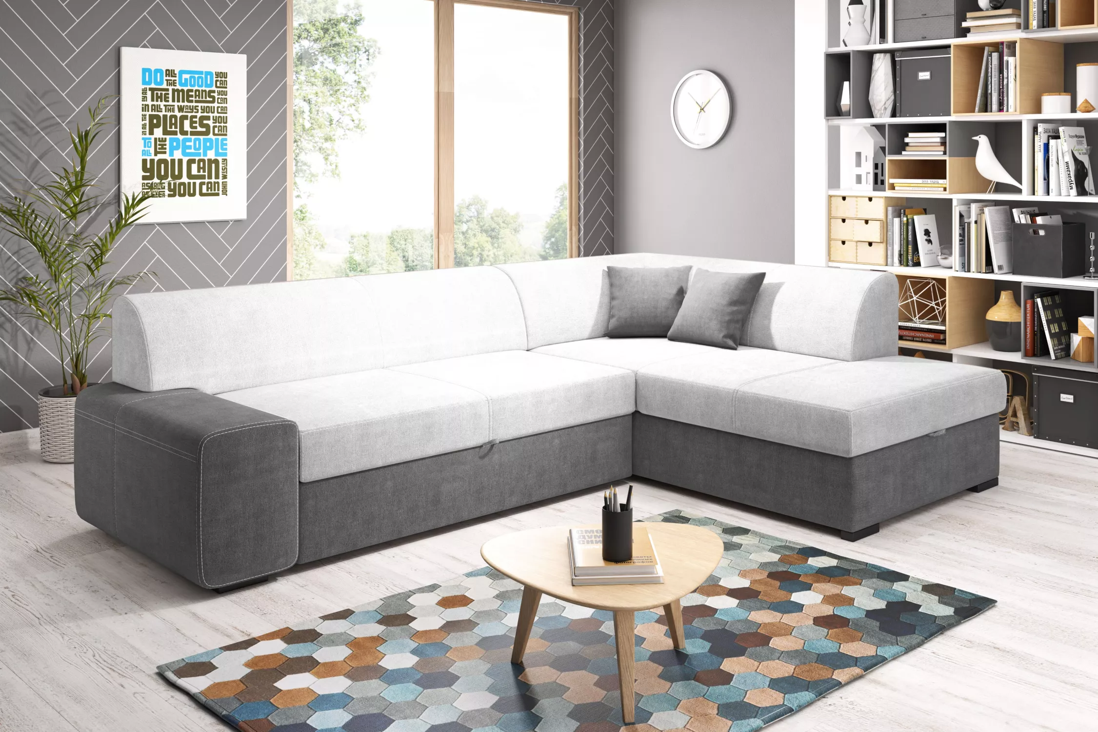 Rohová sedací souprava VALTRUDA díky svým rozměrům a zpracování skvěle zapadne i do menšího obývacího pokoje. Sedačka disponuje rozkládací funkcí na lůžko o rozměrech 135x195 cm a úložným prostorem.