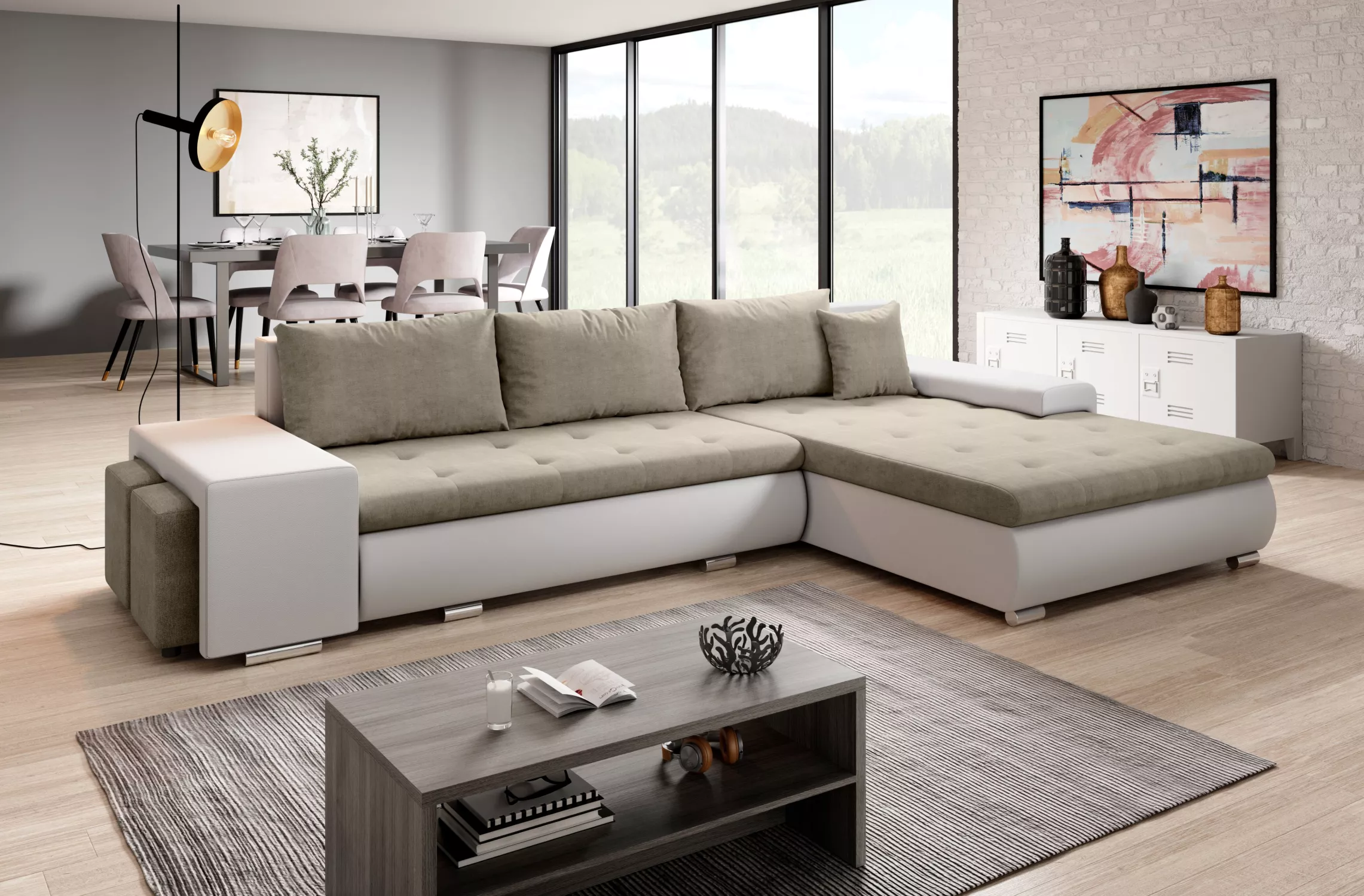 Rohová sedací souprava s taburety EDERA je vyrobena z vysoce kvalitních a odolných materiálů. Výhodou je rozkládací funkce, díky které vytvoříte místo k přespání pro vaši návštěvu. Sedačka také disponuje úložným prostorem.