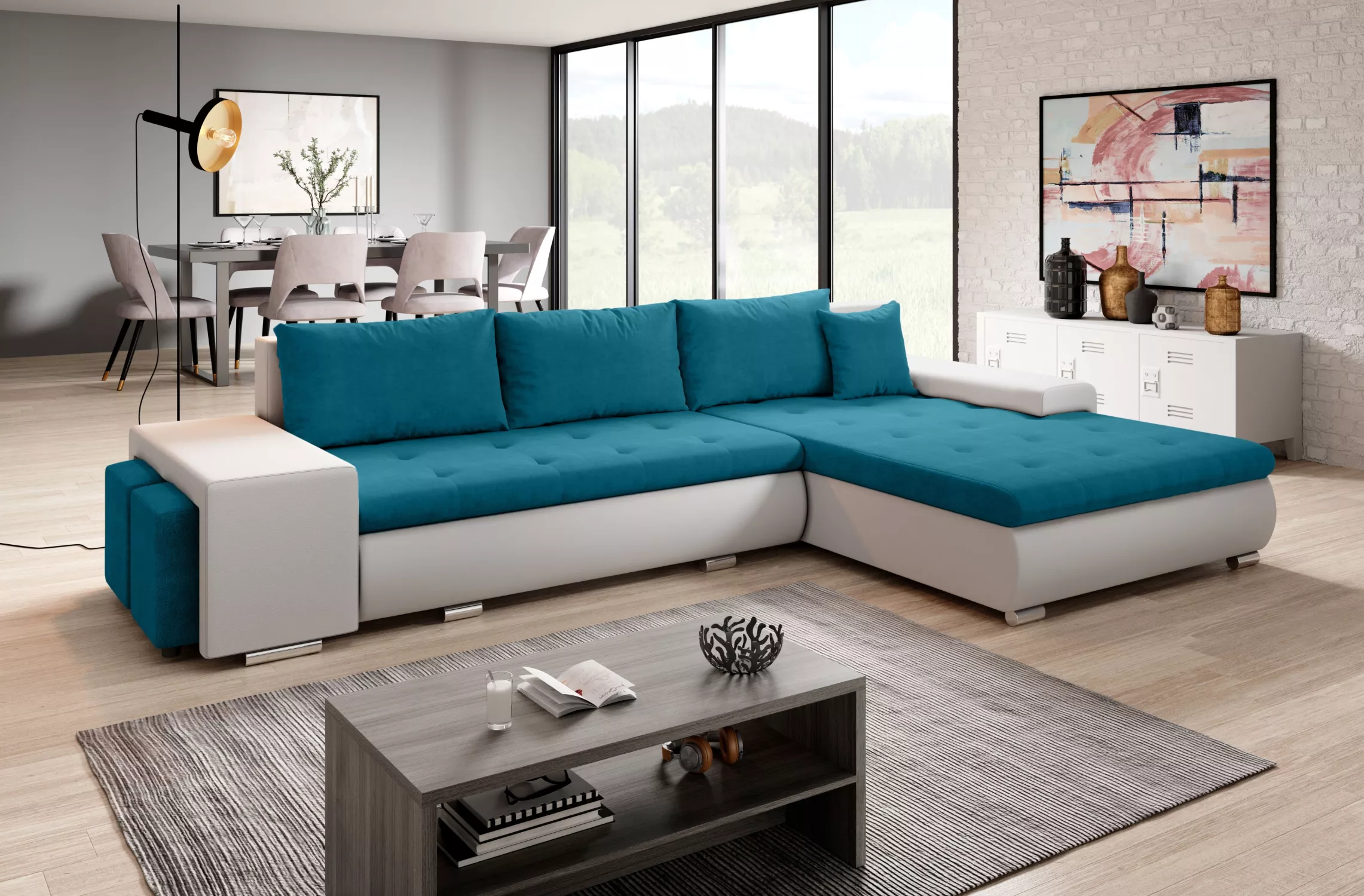 Rohová sedací souprava s taburety EDERA je vyrobena z vysoce kvalitních a odolných materiálů. Výhodou je rozkládací funkce, díky které vytvoříte místo k přespání pro vaši návštěvu. Sedačka také disponuje úložným prostorem.