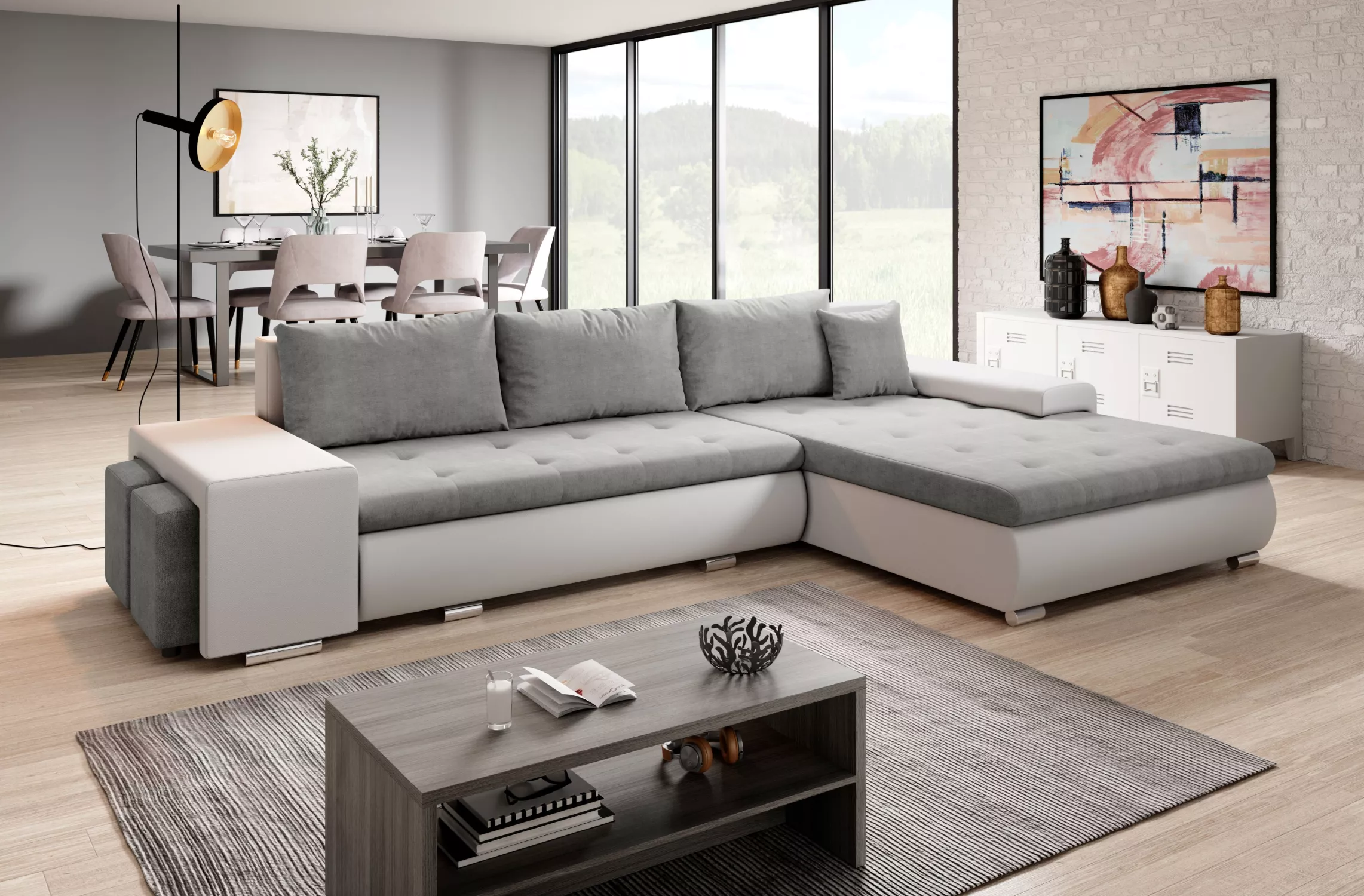 Rohová sedací souprava s taburety EDERA - bílá / světle šedá