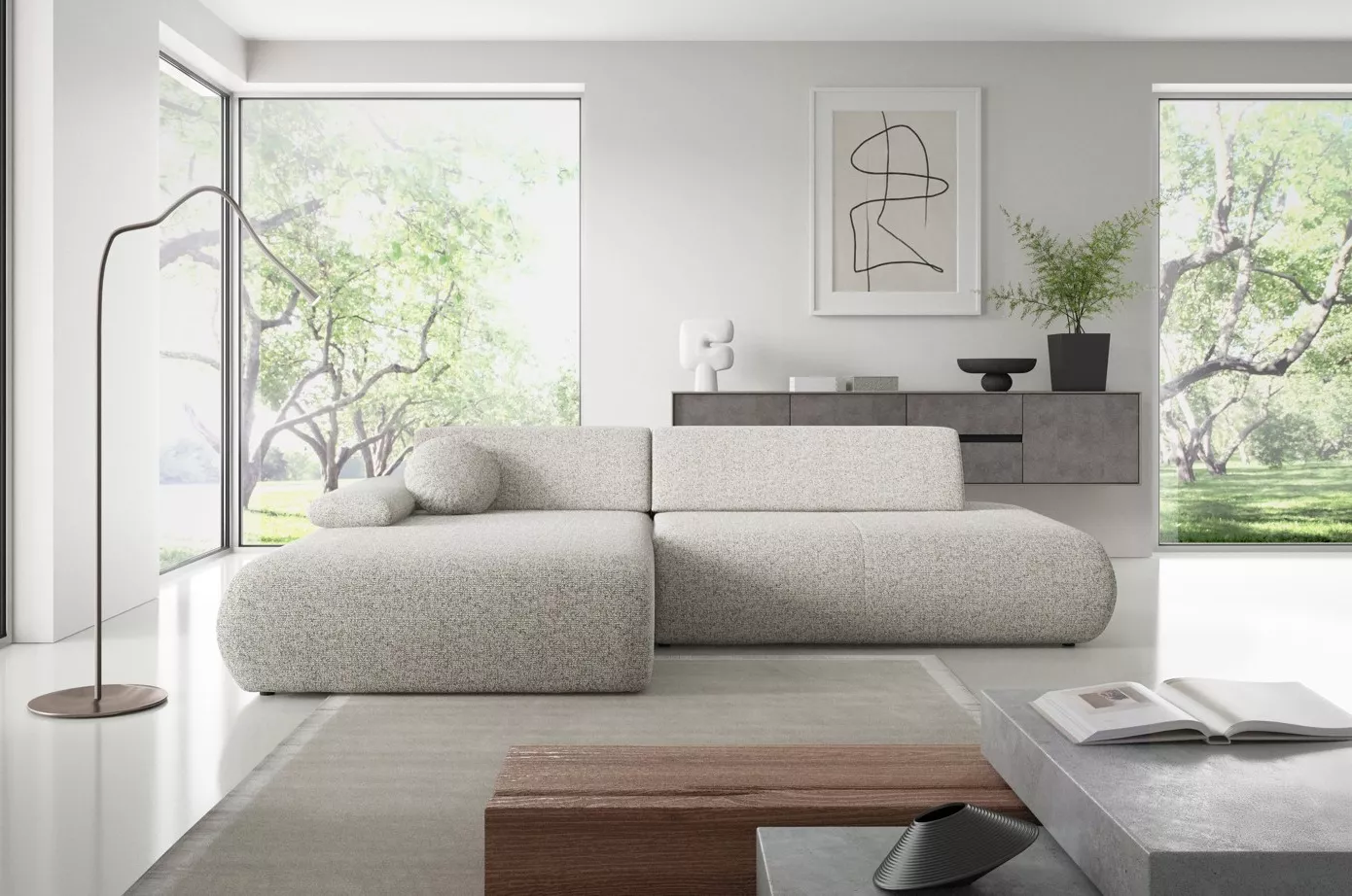 Dopřejte si pohodlí i styl s rohovou sedačkou SURREY 1! Elegantní zaoblené tvary a volně ložené opěrné polštáře vytvoří útulný prostor pro každodenní relax. Díky rozkládací funkci proměníte sedačku na spací lůžko o velikosti 140x213 cm, nechybí ani praktický úložný prostor.