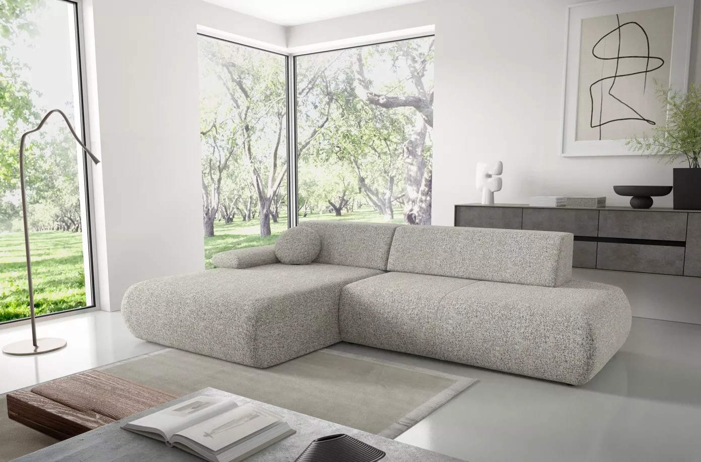Dopřejte si pohodlí i styl s rohovou sedačkou SURREY 1! Elegantní zaoblené tvary a volně ložené opěrné polštáře vytvoří útulný prostor pro každodenní relax. Díky rozkládací funkci proměníte sedačku na spací lůžko o velikosti 140x213 cm, nechybí ani praktický úložný prostor.