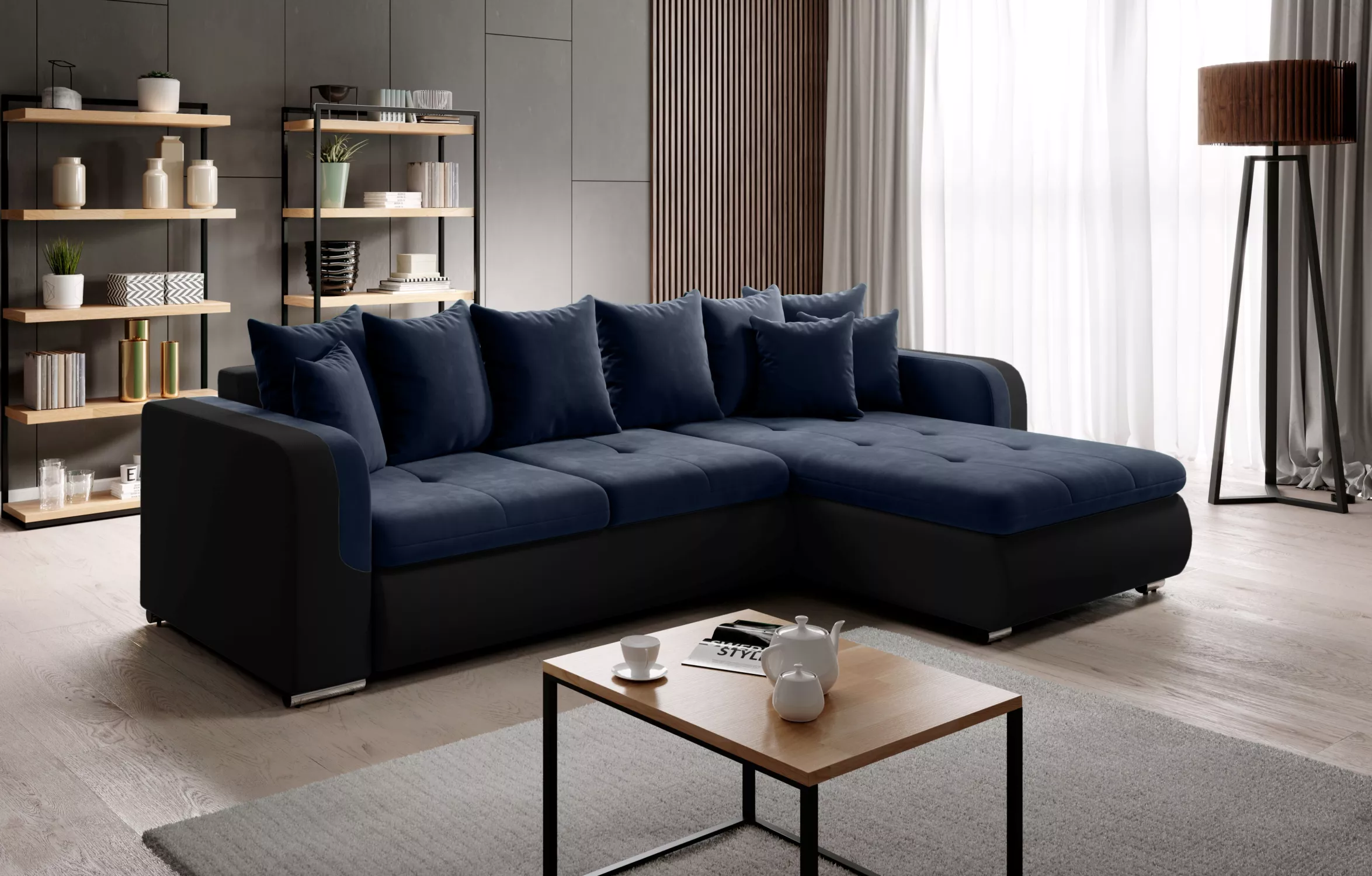 Rohová sedací souprava DAFNI MINI - černá / tmavě modrá, pravý roh