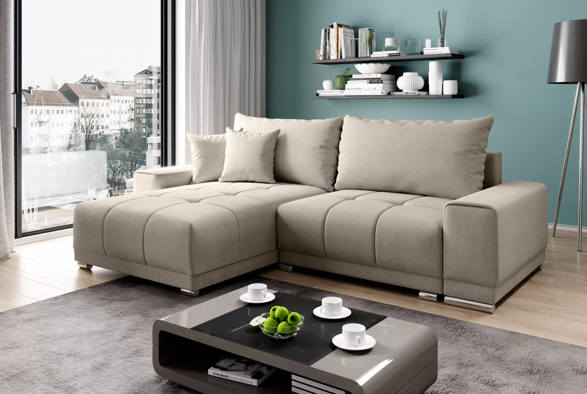 Sedací souprava s úložným prostorem VELIKA svým designem zapadne do všech moderních obývacích pokojů. Opěradlo ve formě volně ložených polštářů vám zpříjemní každodenní používání. Zadní část sedačky je čalouněná látkou, což umožňuje její umístění kdekoliv v místnosti.
