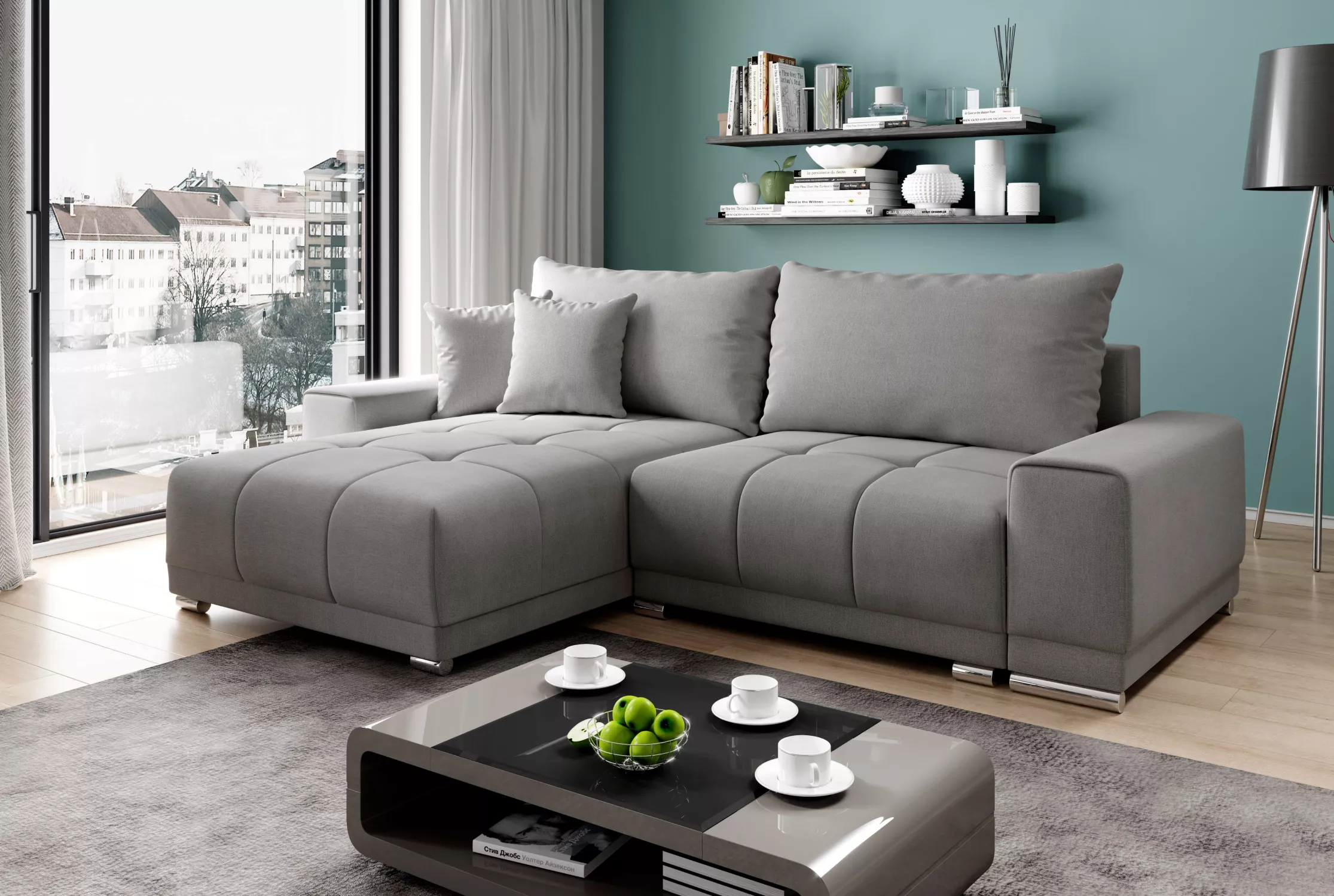 Sedací souprava s úložným prostorem VELIKA svým designem zapadne do všech moderních obývacích pokojů. Opěradlo ve formě volně ložených polštářů vám zpříjemní každodenní používání. Zadní část sedačky je čalouněná látkou, což umožňuje její umístění kdekoliv v místnosti.