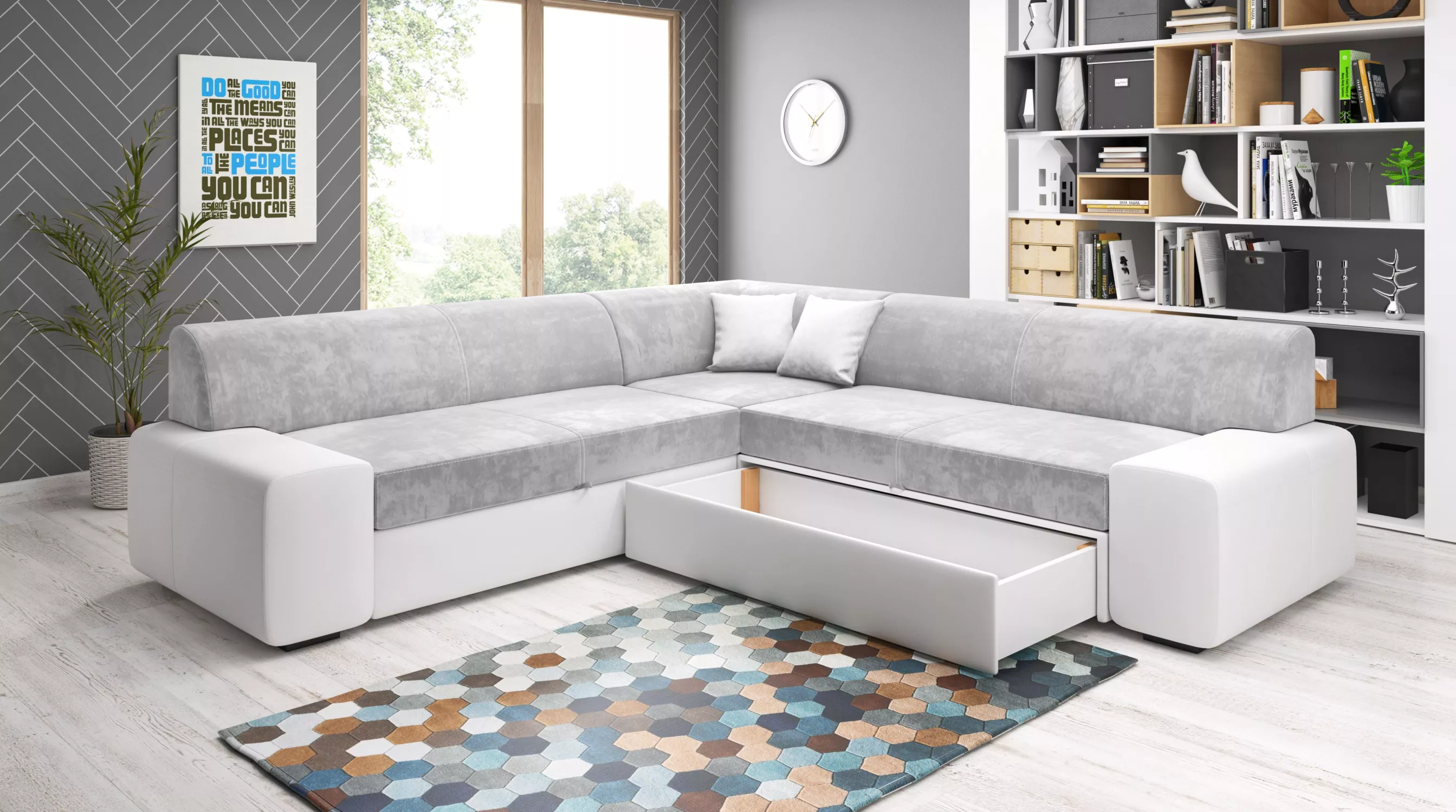 Rozkládací sedací souprava VALTRUDA MAXI díky svým rozměrům a zpracování skvěle zapadne i do menšího obývacího pokoje. Sedačka disponuje rozkládací funkcí na lůžko o rozměrech 135x195 cm a úložným prostorem.