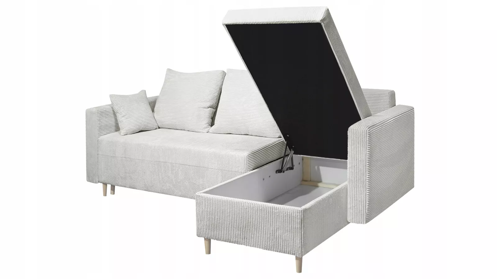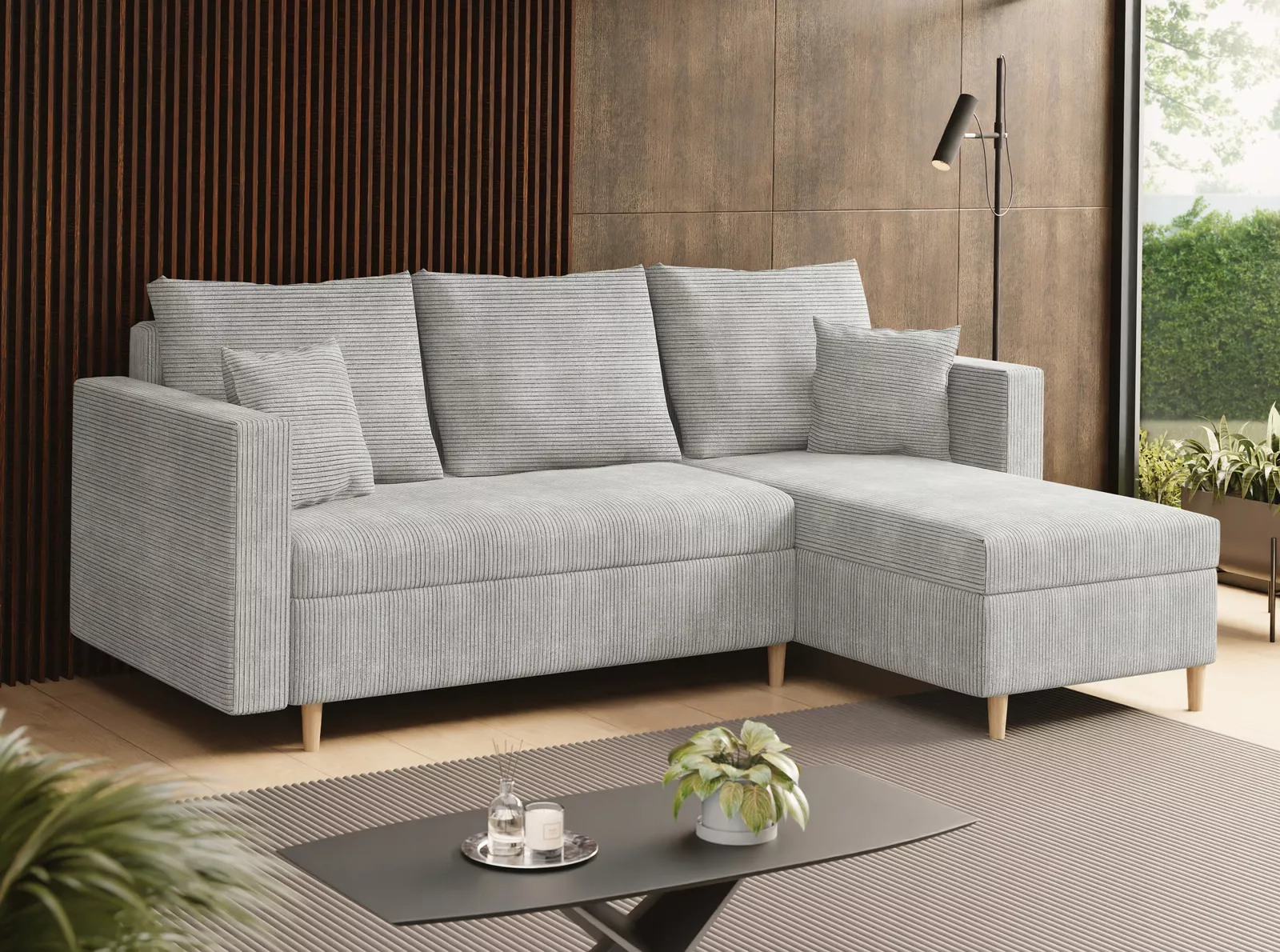 Rohová sedací souprava IDORA se hodí do každého moderního interiéru díky proužkovanému čalounění a čistým liniím. Samozřejmostí je rozkládací funkce pro příležitostné spaní a praktický úložný prostor.