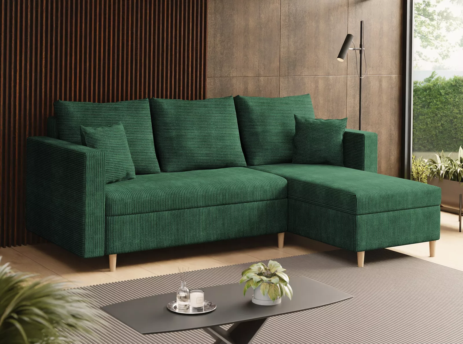 Rohová sedací souprava IDORA se hodí do každého moderního interiéru díky proužkovanému čalounění a čistým liniím. Samozřejmostí je rozkládací funkce pro příležitostné spaní a praktický úložný prostor.