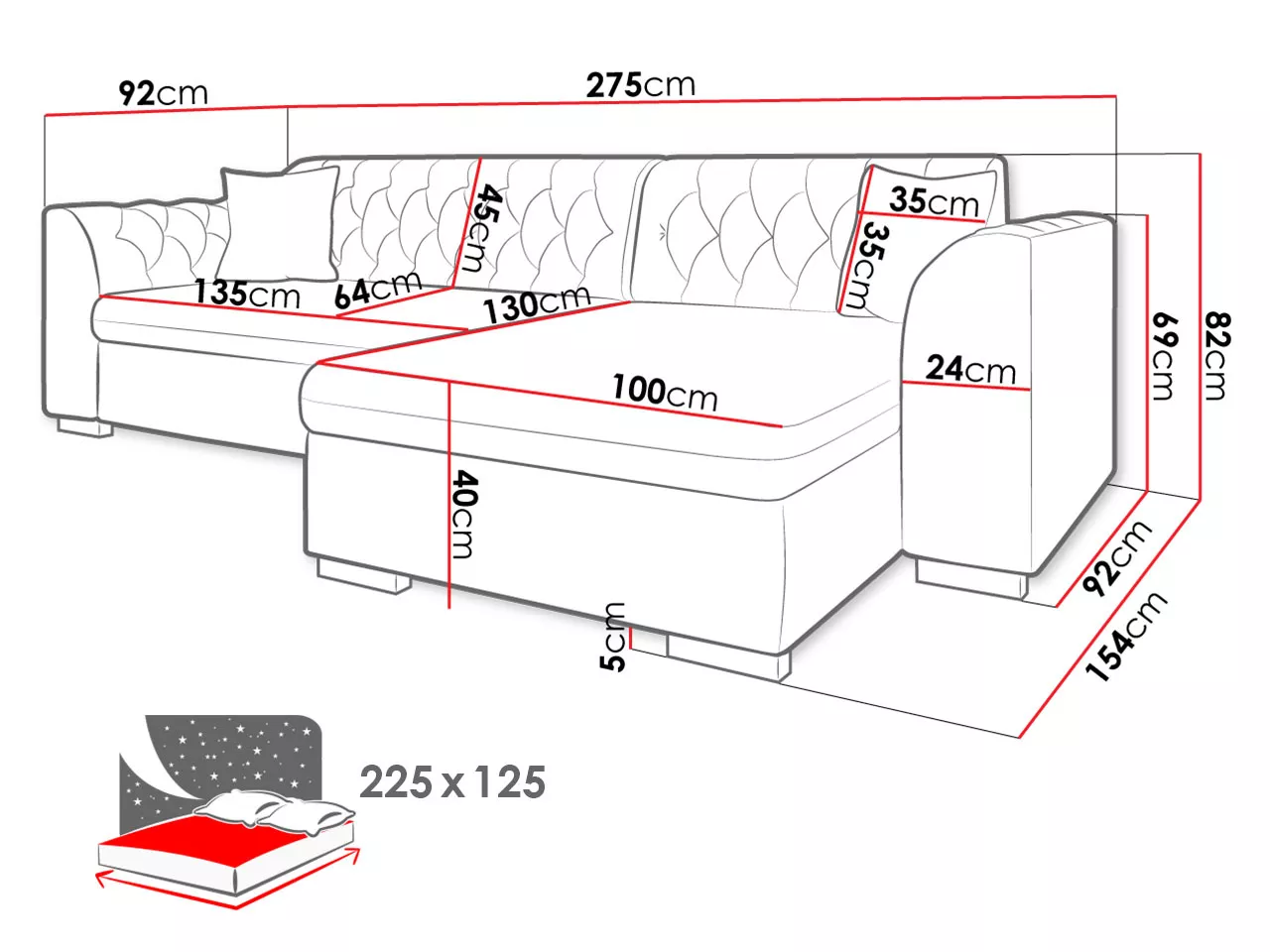 Rohová sedačka ANEKO se vyznačuje moderním designem s hlubokým prošíváním a vysokým komfortem, který zaručuje použitá kvalitní výplň. Nabízí funkci každodenního spaní o lůžku 125x225 cm a praktický úložný prostor. Součástí sedačky jsou 2 malé polštáře se snímatelným potahem na zip.