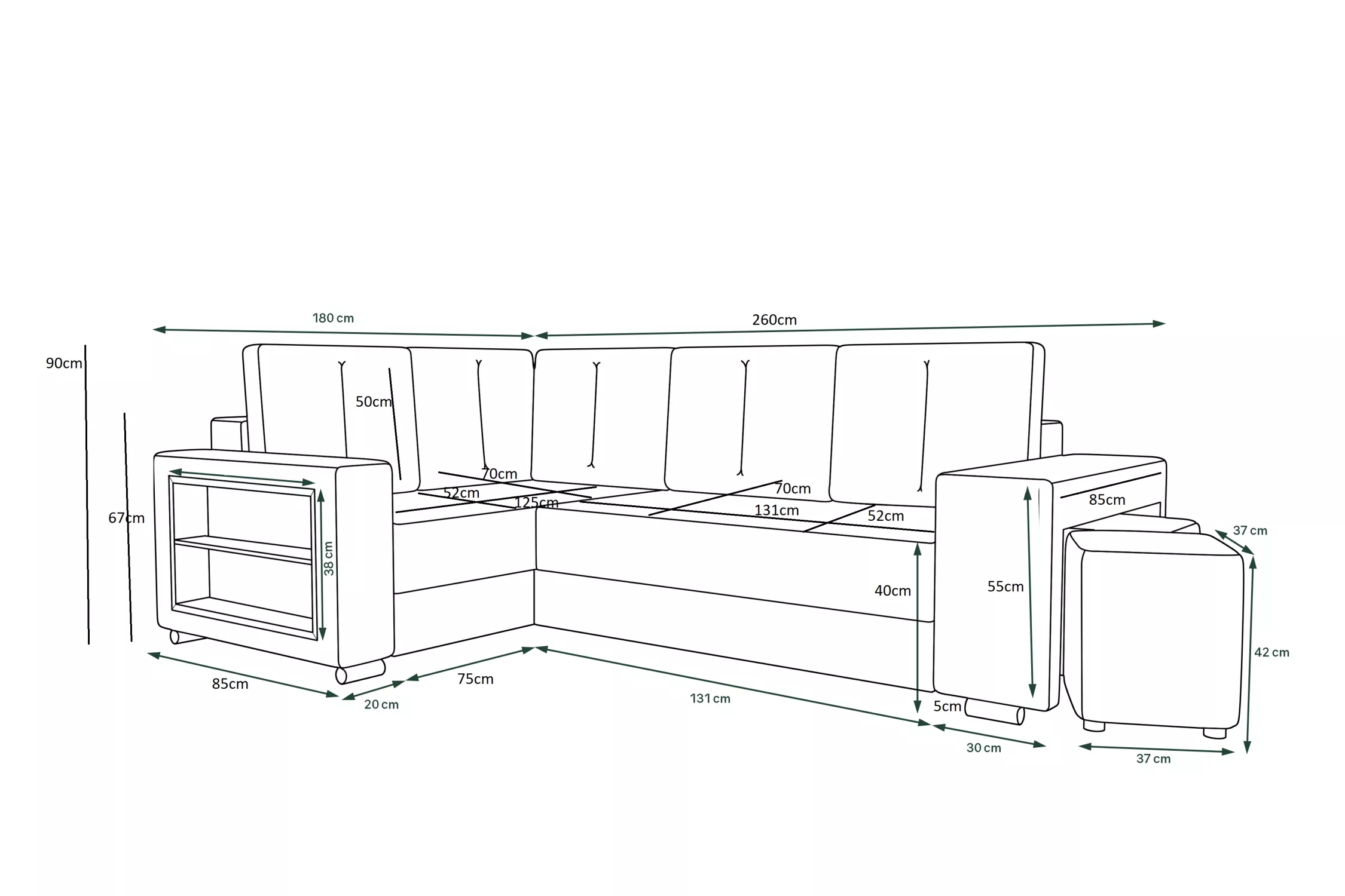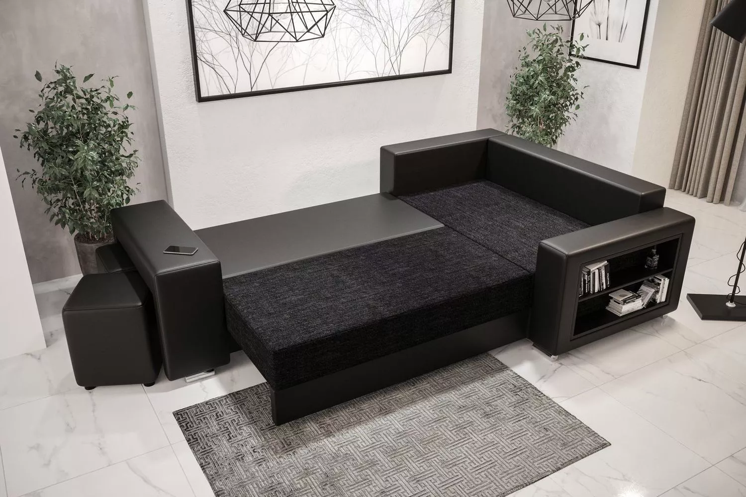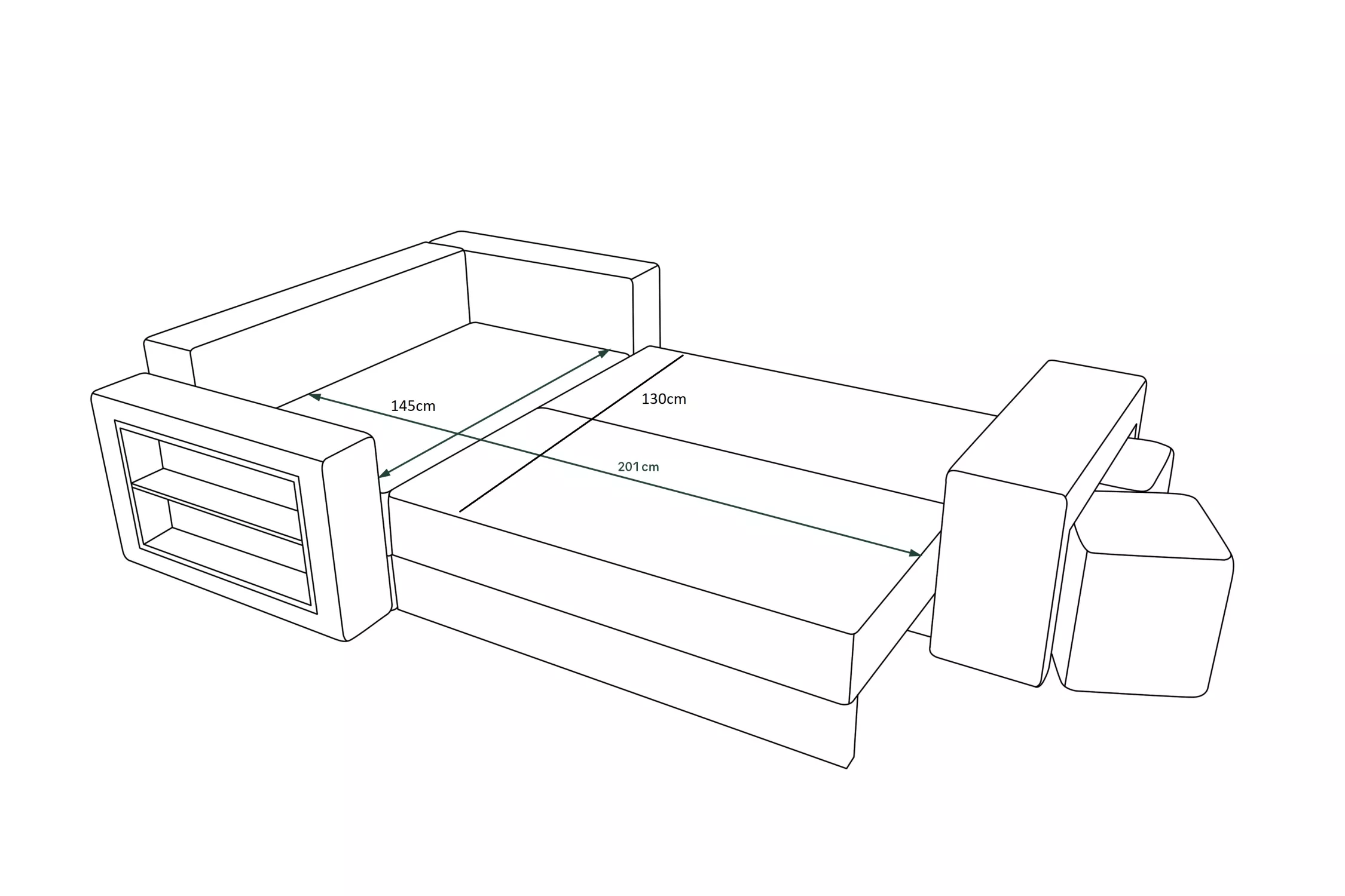 Elegantní vzhled v kombinaci s praktickou stránkou. Tak to je přesně sedačka, kterou vám chceme nabídnout. Sedačka má na jedné straně odkládací poličku, na druhé dva praktické taburety. Úložný prostor a snadné rozkládání pohovky na lůžkovou podobu ji taky přidávají na atraktivitě. Součástí je pět velkých polštářů na zip, vyplněné mletou PUR pěnou. Chromované nožičky zaručují ladnost a stabilitu.