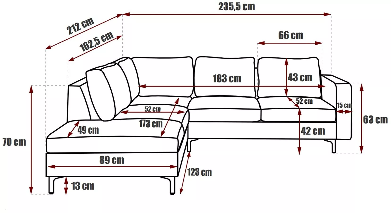 Rohová sedačka je vyrobena v kombinaci kvalitního LTD a masivu. Jednoduché linie jsou doplněny velkými polštáři, které slouží jako opěrky. Ty jsou vyplněny pěnou pro maximální pohodlí. Sedačka stojí na kovových nožičkách. Zadní strana sedačky je potažena látkou, lze ji tedy umístit i do prostoru.