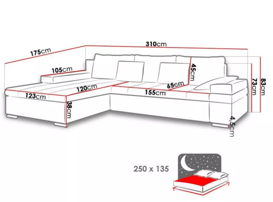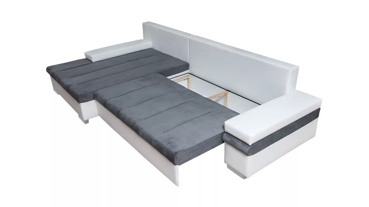 Rohová sedací souprava zaujme svou funkčností. Byla zkonstruována jako písmeno L, což znamená, že má dostatek prostoru na sezení pro hosty a sledování televize vleže. Jednoduchým rozložením získáte spací plochu o rozměrech 135 x 250 cm. Zadní část rohu je čalouněná látkou, což umožňuje její umístění kdekoli v místnosti. Sedací souprava nabízí praktický úložný prostor na ložní prádlo, který může sloužit také jako místo pro sezónní oblečení.