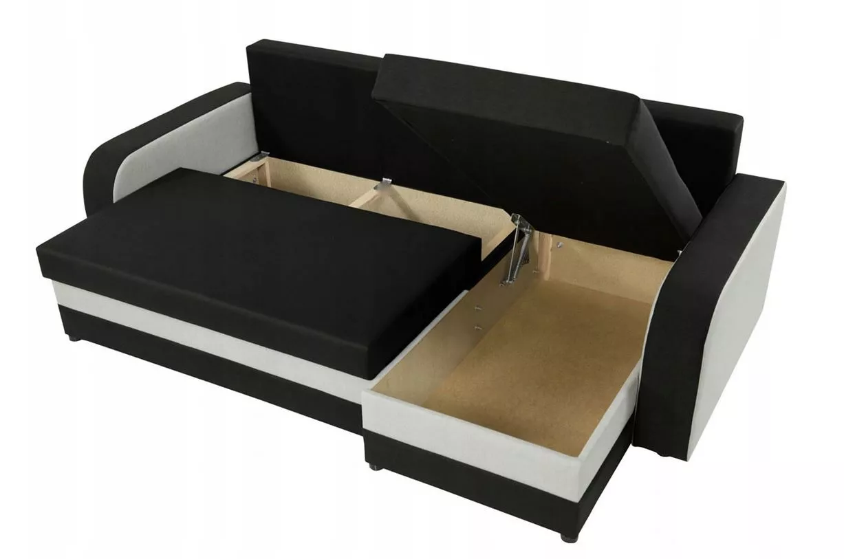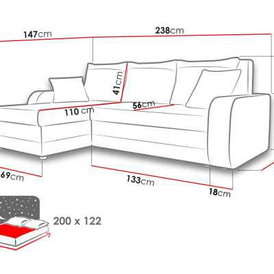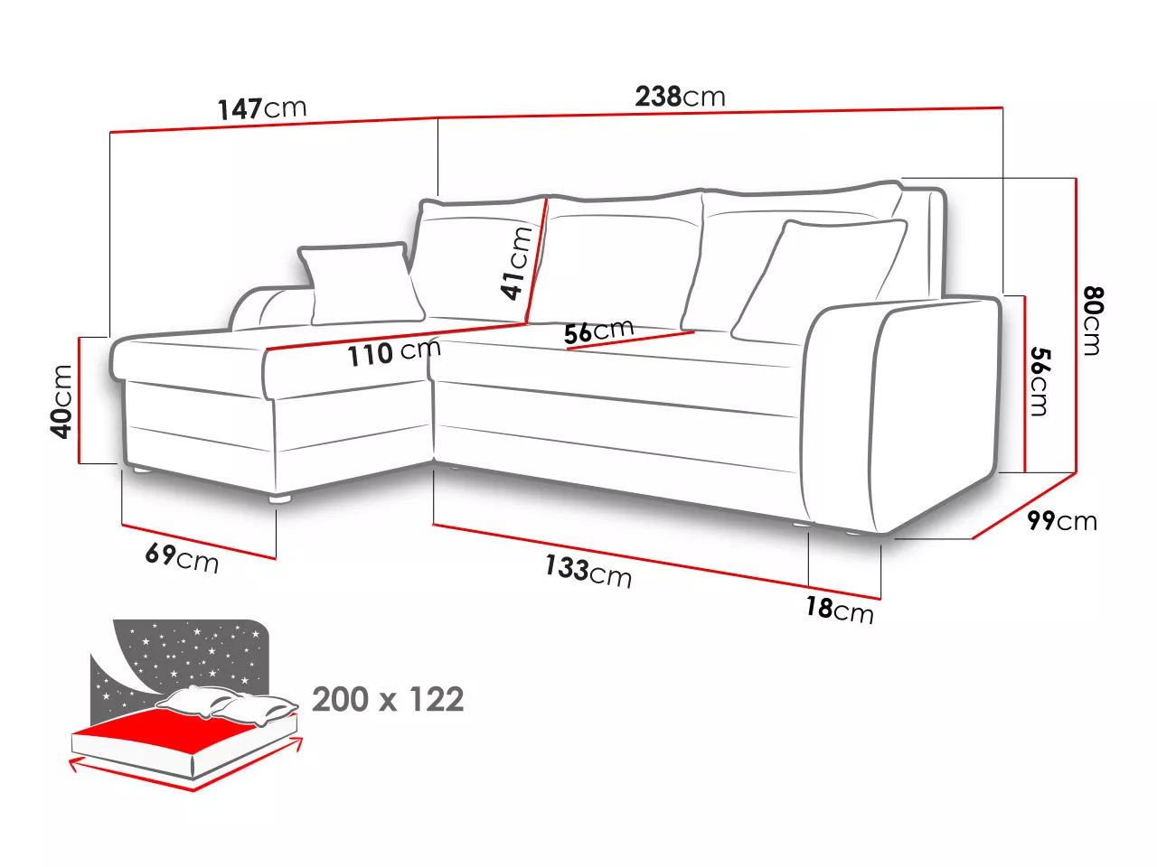 Rohová sedací souprava KORNELIE zaujme svou funkčností. Byla zkonstruována jako písmeno L, což znamená, že má dostatek prostoru na sezení pro hosty a sledování televize vleže. Jednoduchým rozložením získáte spací plochu o rozměrech 122x200 cm. V sedací soupravě jsou umístěny 2 praktické úložné prostory na ložní prádlo, které mohou sloužit také jako místo pro sezónní oblečení.
