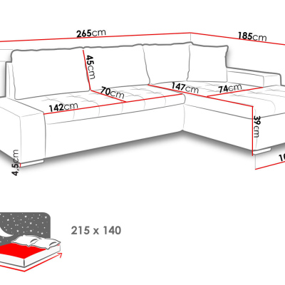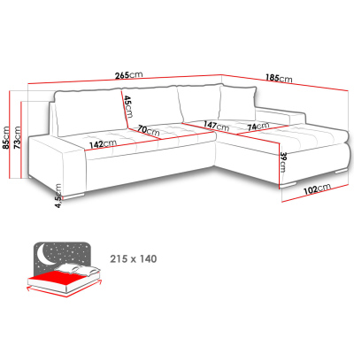 Rohová sedací souprava ABEL 2 se vyznačuje stylovým designem. Rozkládací sedačka, která je k dispozici v nejmódnější barevné kombinaci, zkrášlí interiér vyzdobený v moderním stylu. Dá vám prostor na pohodlný odpočinek po náročném dni a umožní vám trávit volný čas s přáteli a rodinou. Jednoduchým rozložením získáte spací plochu o rozměrech 140x215 cm. V sedací soupravě naleznete praktický úložný prostor na ložní prádlo, který lze také například využít jako místo pro úschovu sezónního oblečení.