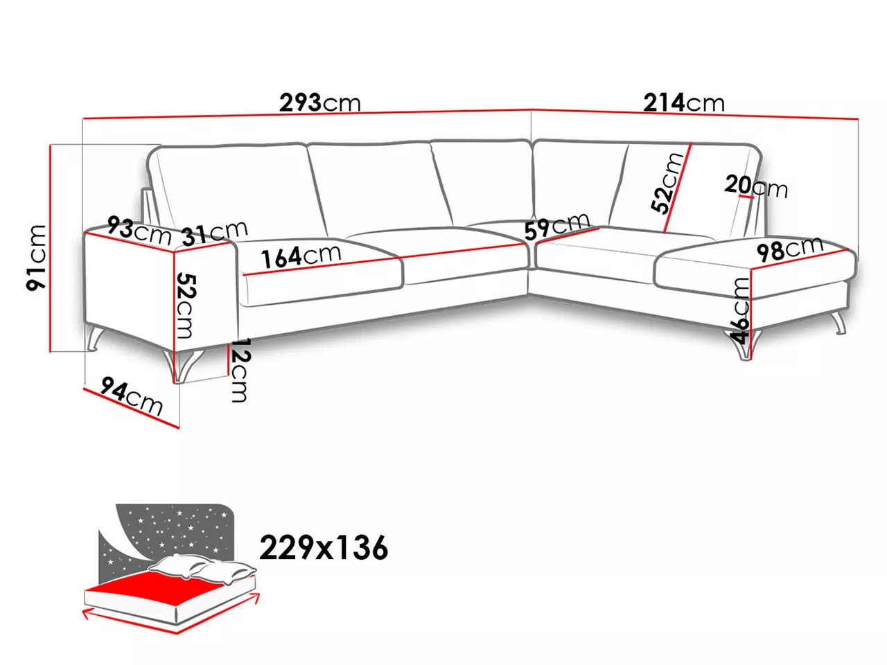 Rohová sedací souprava LANSING 2 se vyznačuje stylovým designem. Rozkládací rohová sedací souprava, která je k dispozici v nejmódnější barevné kombinaci, zkrášlí interiér vyzdobený v moderním stylu. Dá vám prostor na pohodlný odpočinek po náročném dni a umožní vám trávit volný čas s přáteli a rodinou. Jednoduchým rozložením získáte spací plochu o rozměrech 136x229 cm. V sedací soupravě se nachází praktický úložný prostor na ložní prádlo, který lze například využít jako místo pro úschovu sezónního oblečení.