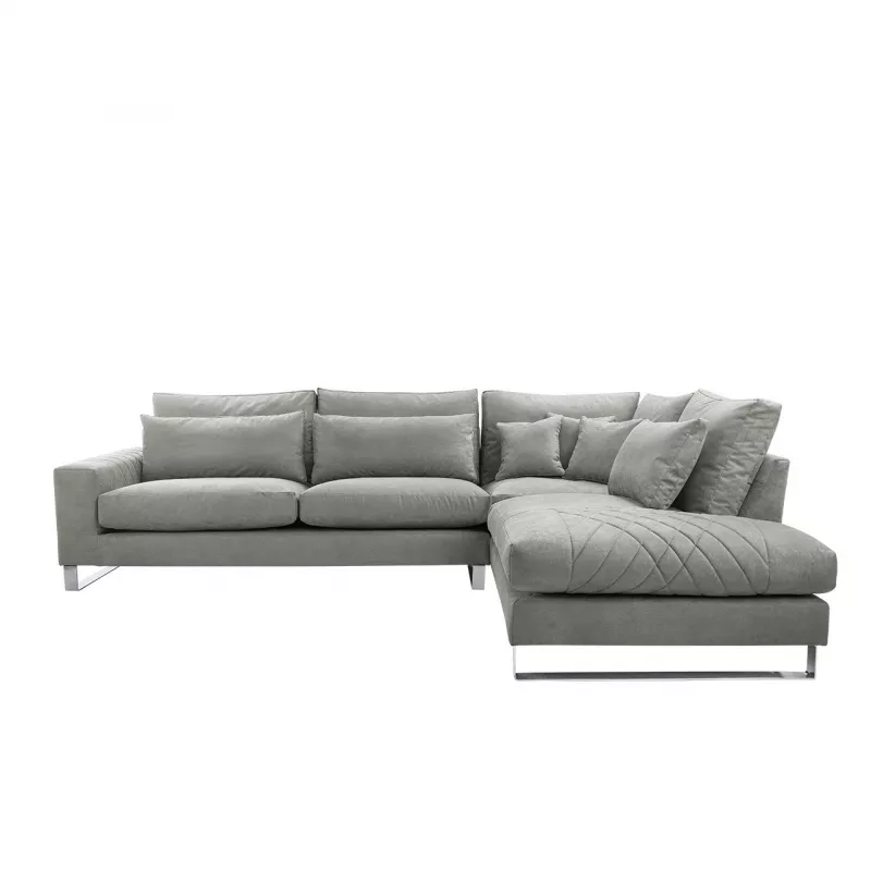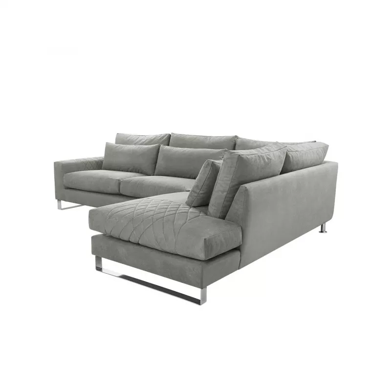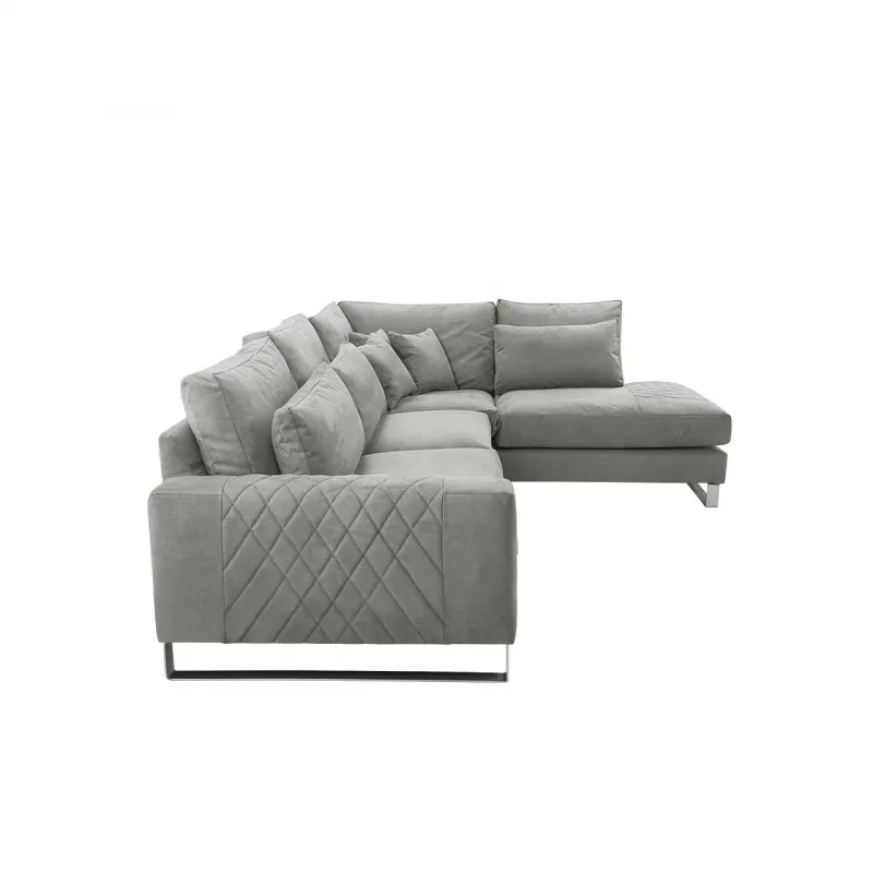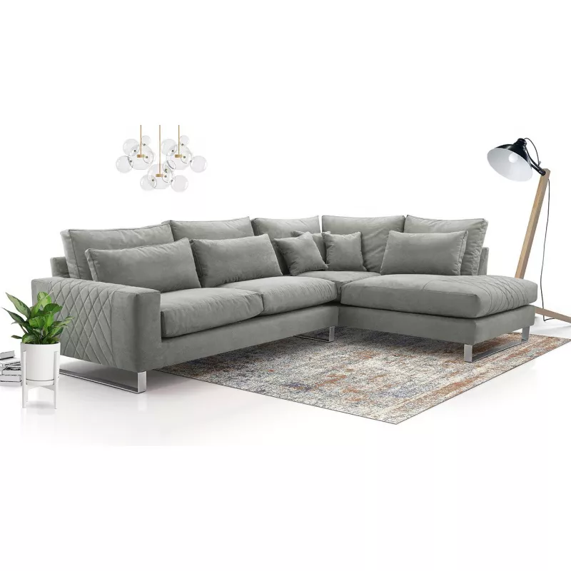 Rohová sedací souprava APARTADA se vyznačuje stylovým designem. Sedací souprava, která je k dispozici v nejmódnější barevné kombinaci, zkrášlí interiér vyzdobený v moderním stylu. Dá vám prostor na pohodlný odpočinek po náročném dni a umožní vám trávit volný čas s přáteli a rodinou. Vysoké kovové nohy v chromové barvě dodávají sedačce lehkost. Dalším dekorativním prvkem je prošívání, které vede podél loketní opěrky. Sedadlo sedačky je vyrobeno z vrstvy vysoce elastické pěny, pěnového granulátu a vlnových pružin typu A. Taková kombinace zaručuje vysoký komfort používání. Na druhé straně je opěradlo sedačky vyrobené z pohyblivých polštářů různých velikostí. Povlaky na polštář mají zip.