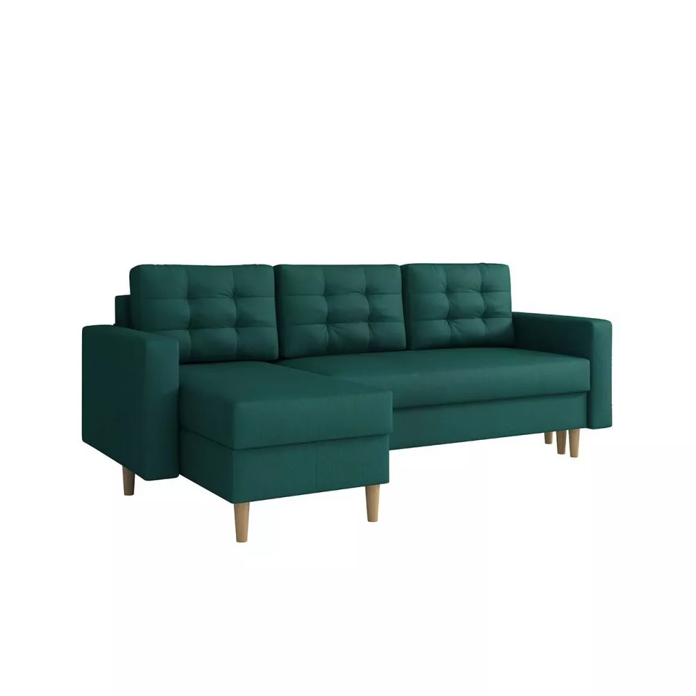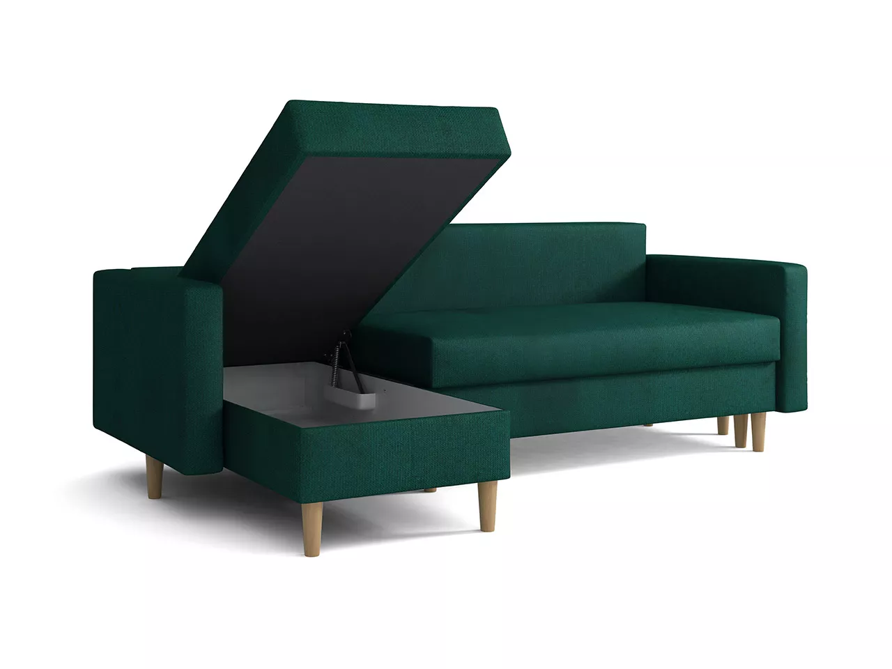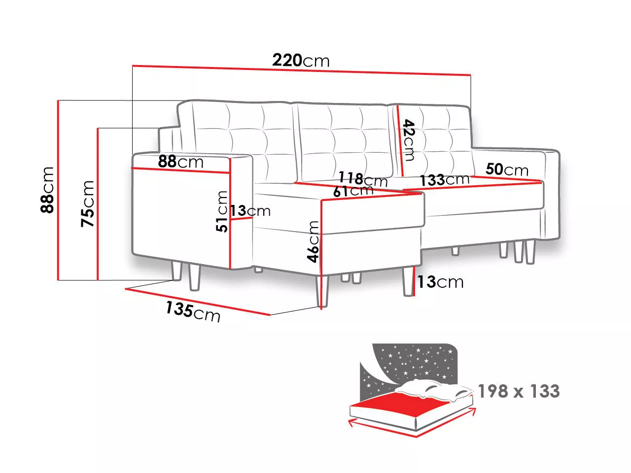 Rohová sedací souprava KALABOZO se vyznačuje stylovým designem. Rozkládací sedačka, která je k dispozici v nejmódnější barevné kombinaci, zkrášlí interiér vyzdobený ve skandinávském i moderním stylu. Dá vám prostor na pohodlný odpočinek po náročném dni a umožní vám trávit volný čas s přáteli a rodinou. Jednoduchým rozložením získáte spací plochu o rozměrech 133x198 cm. V sedací soupravě naleznete praktický úložný prostor na ložní prádlo, který lze například také využít jako místo pro úschovu sezónního oblečení.