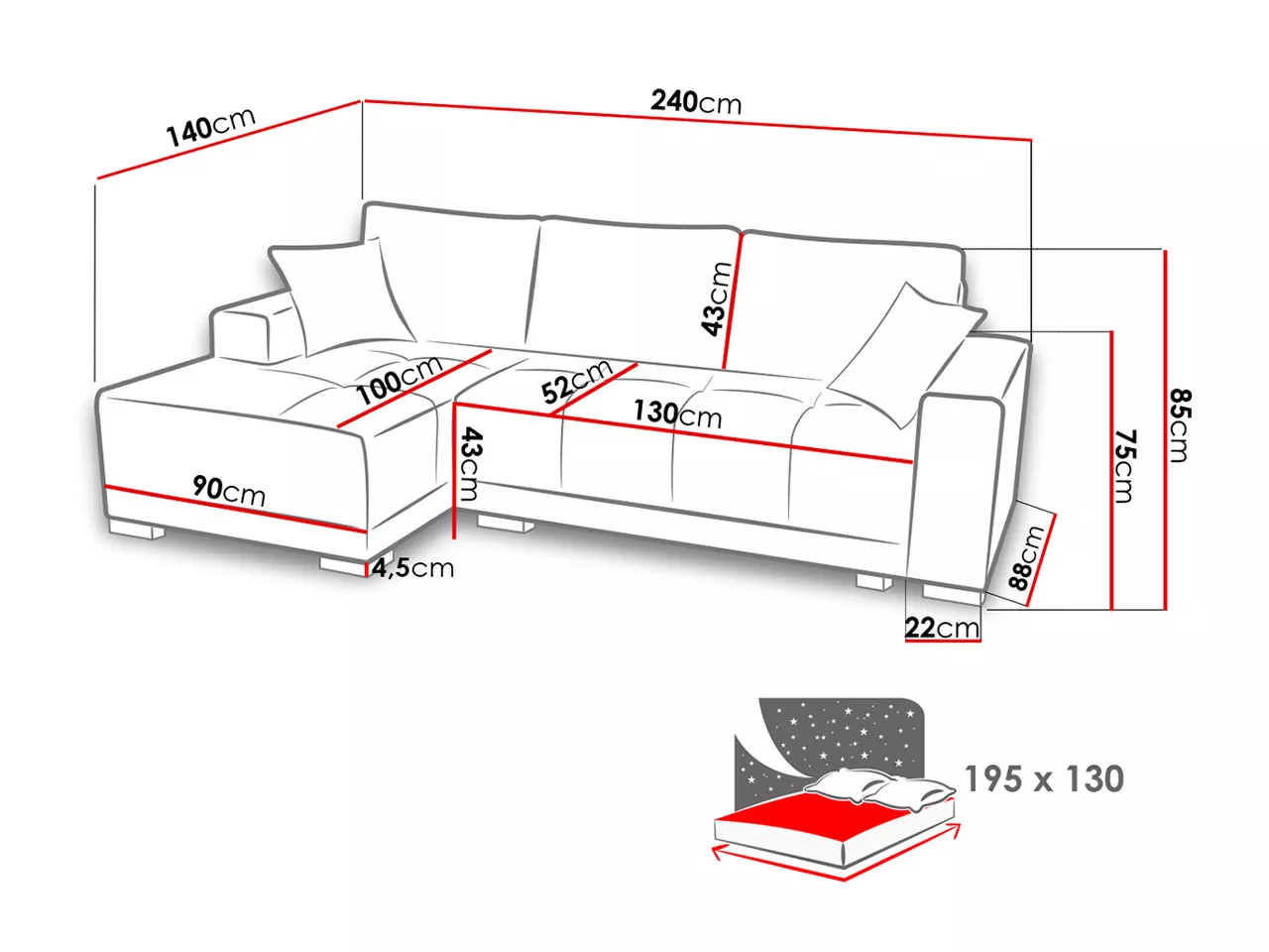 Rohová sedací souprava s úložným prostorem FELIPU se vyznačuje stylovým designem. Rozkládací sedačka, která je k dispozici v nejmódnější barevné kombinaci, zkrášlí interiér vyzdobený v moderním stylu. Dá vám prostor na pohodlný odpočinek po náročném dni a umožní vám trávit volný čas s přáteli a rodinou. Jednoduchým rozložením získáte spací plochu o rozměrech 130x195 cm. V sedací soupravě naleznete praktický úložný prostor na ložní prádlo, který lze například také využít jako místo pro úschovu sezónního oblečení.