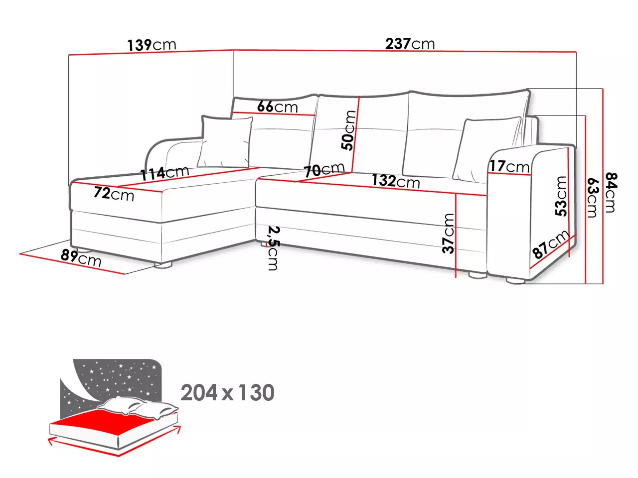 Rohová sedačka na každodenní spaní HORING nabízí spací lůžko o rozměrech 130x204 cm a pohodlnou zádovou opěrku ve formě volně ložených polštářů. Kromě funkce každodenního spaní sedací souprava disponuje také úložným prostorem.