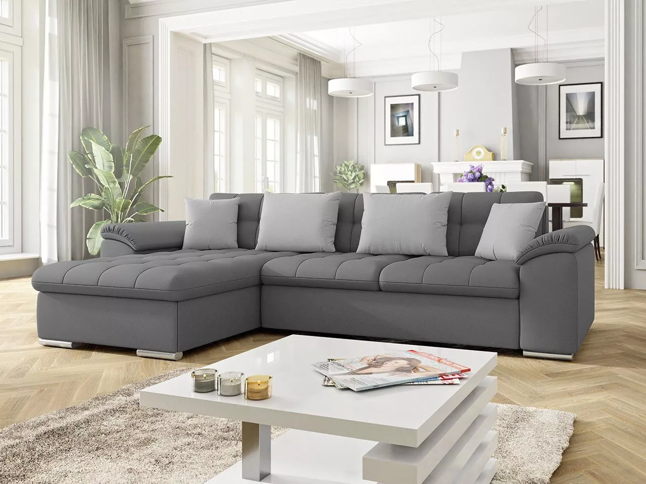 Rohová sedačka DELFINA nabízí funkci každodenního spaní o lůžku 129x227 cm. Nechybí ani praktický úložný prostor. Zadní část sedačky je čalouněná látkou, což umožňuje její umístění kdekoli v místnosti. V ceně jsou polštáře se snímatelným potahem na zip.