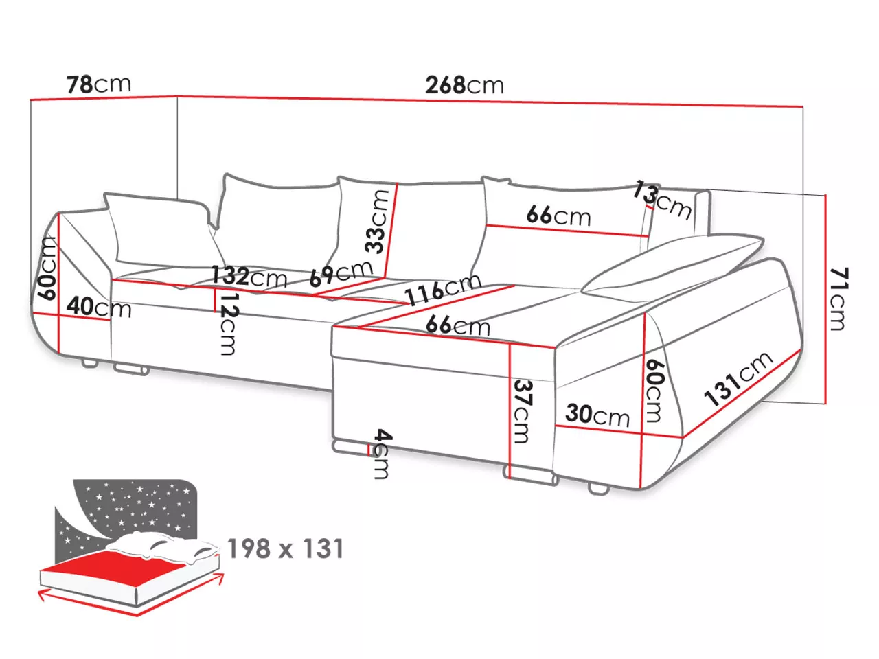 - ložná plocha: 131x198 cm