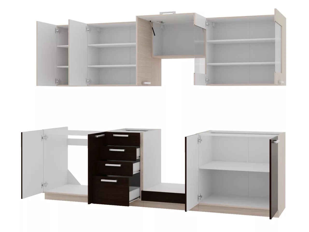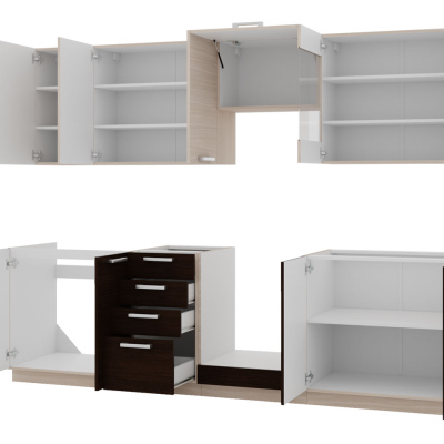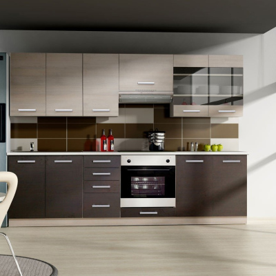 Kuchyňskou linku dodáváme bez vyobrazených spotřebičů, dřezu, vodovodní baterie a dekorací.