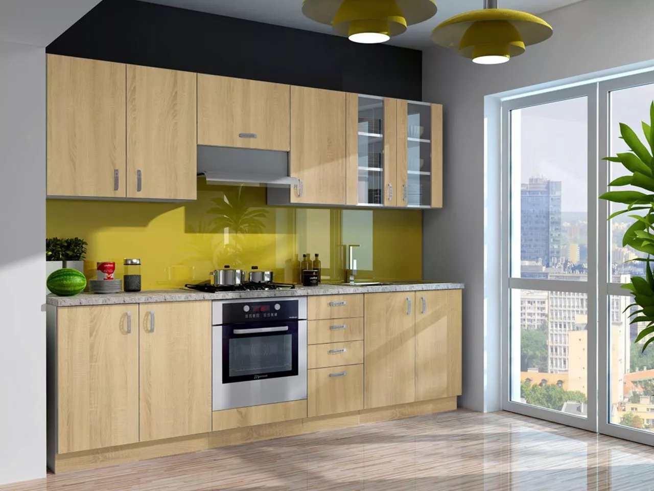 Kuchyňskou linku dodáváme bez vyobrazených spotřebičů, dřezu, vodovodní baterie a dekorací.