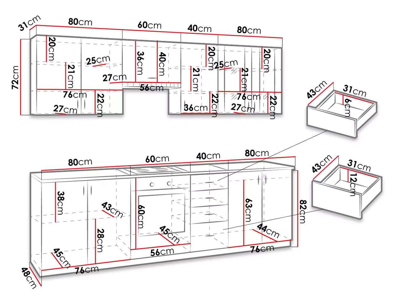 - skříňka pro vestavěnou troubu: 60/82/48 cm
