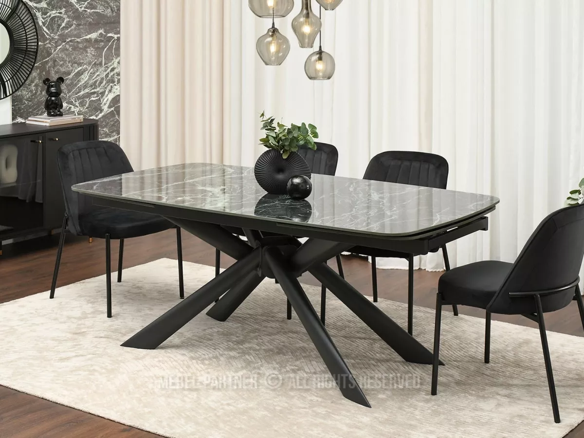 Rozkládací jídelní stůl NODIN zaujme především mramorovanou keramickou horní deskou a výraznými kovovými nohami. Skvěle se hodí do moderních, designových i industriálních interiérů a dodává jim luxus a eleganci.