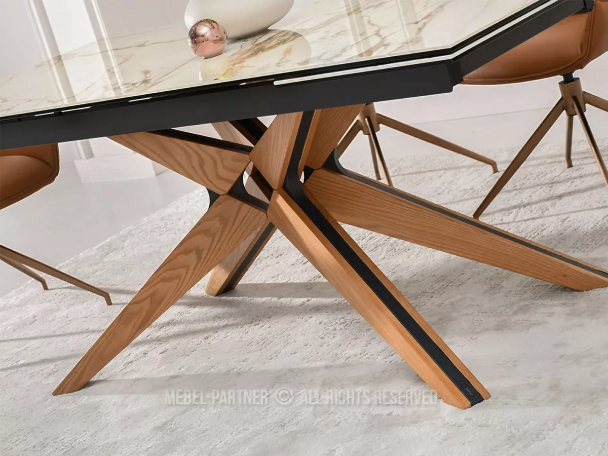 Rozkládací jídelní stůl FEDOR vyniká designovou masivní podstavou, která dodává stolu potřebnou stabilitu. Díky možnosti rozložení na šířku až 260 cm bude stůl ideální při větších rodinných setkáních.