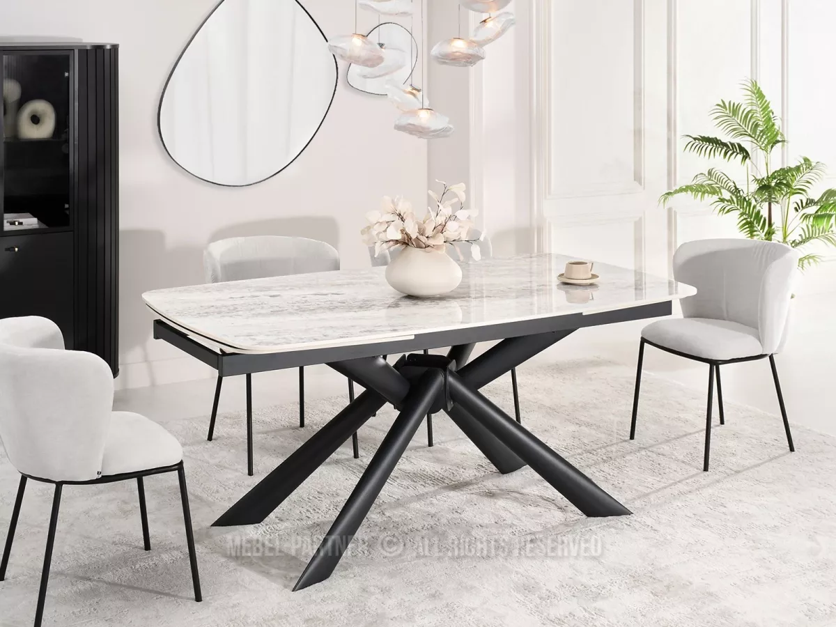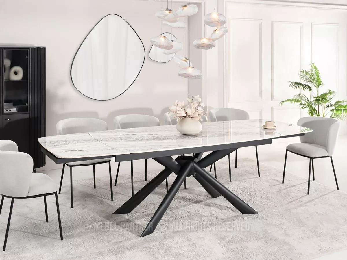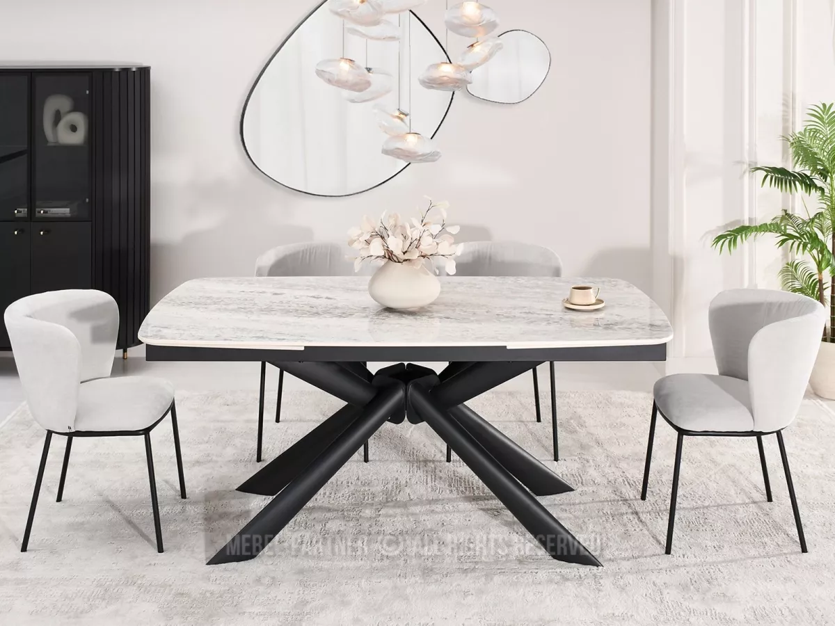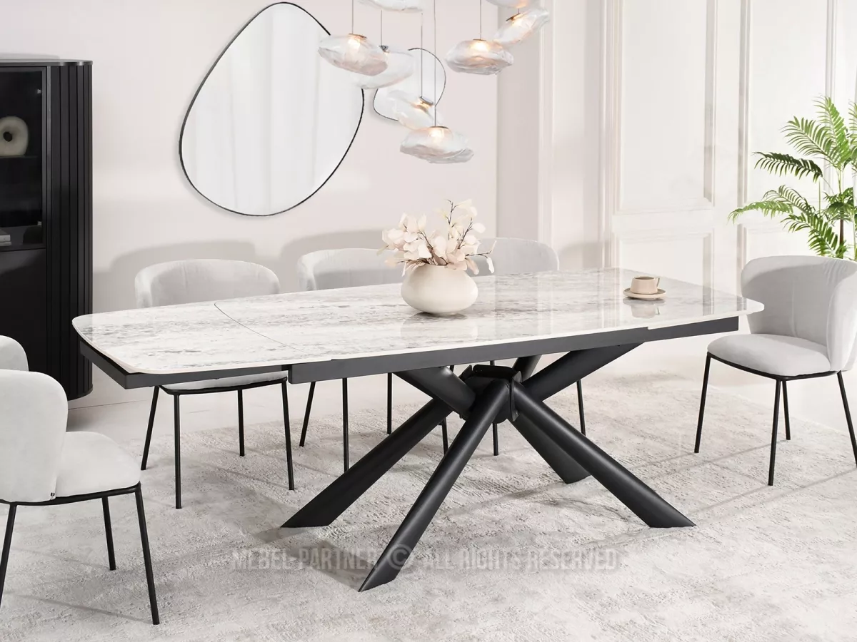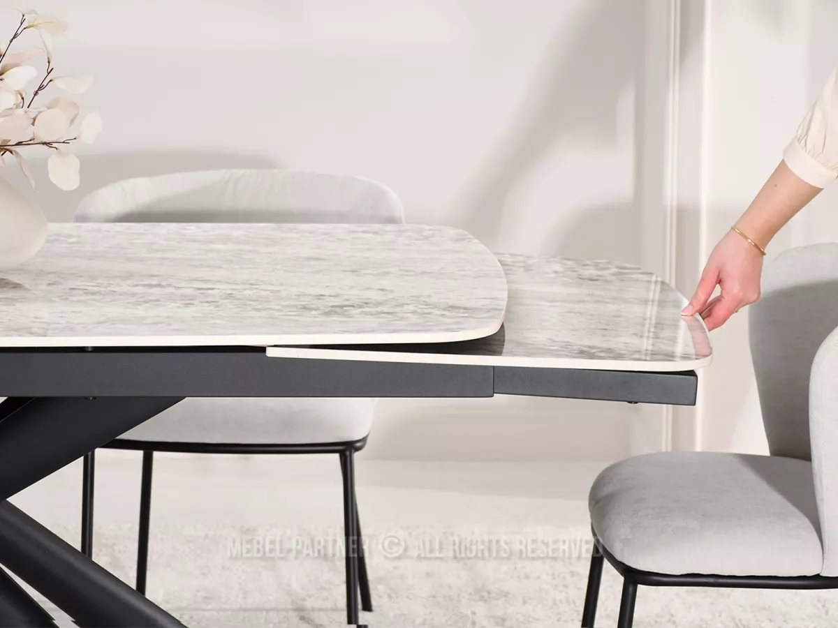 Rozkládací jídelní stůl NODIN zaujme především mramorovanou keramickou horní deskou a výraznými kovovými nohami. Skvěle se hodí do moderních, designových i industriálních interiérů a dodává jim luxus a eleganci.