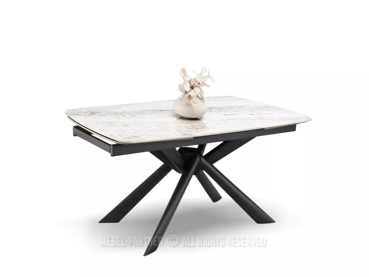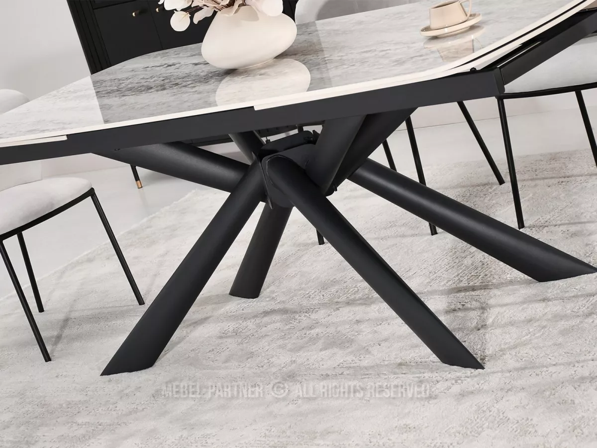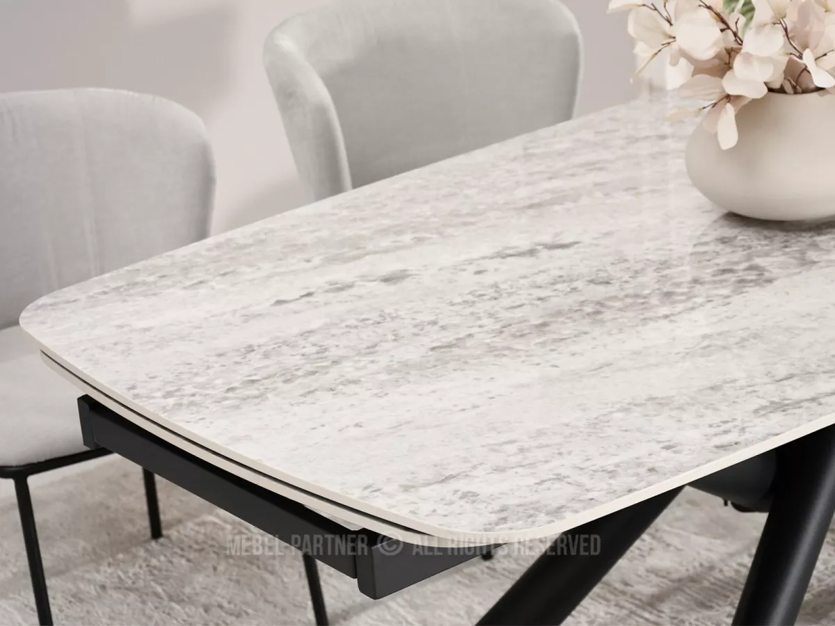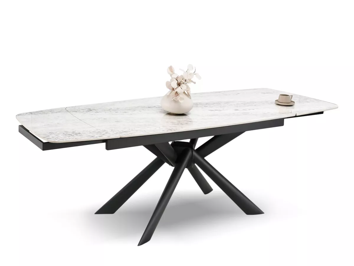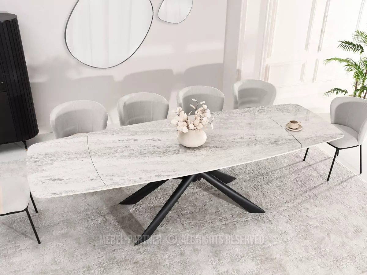 Rozkládací jídelní stůl NODIN zaujme především mramorovanou keramickou horní deskou a výraznými kovovými nohami. Skvěle se hodí do moderních, designových i industriálních interiérů a dodává jim luxus a eleganci.