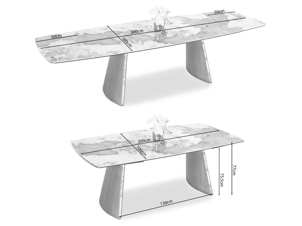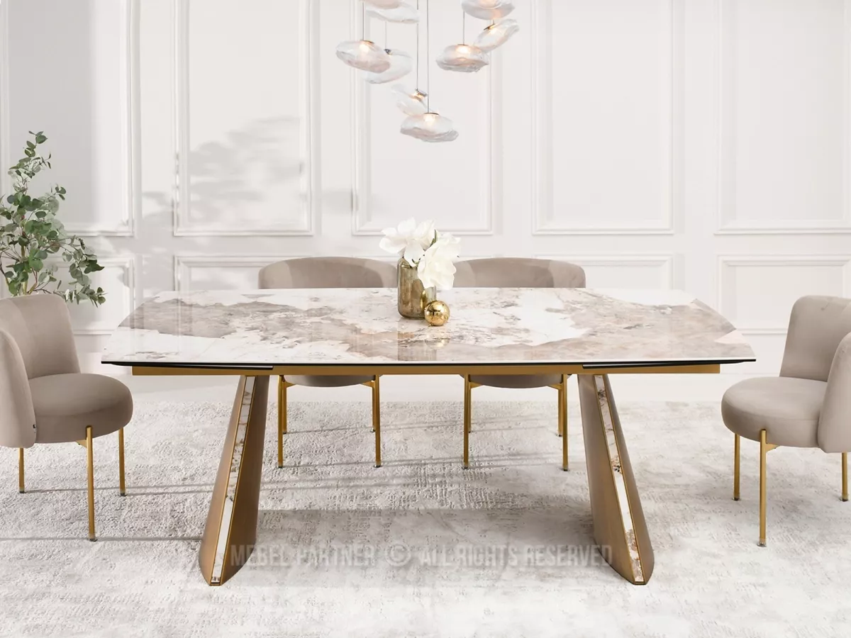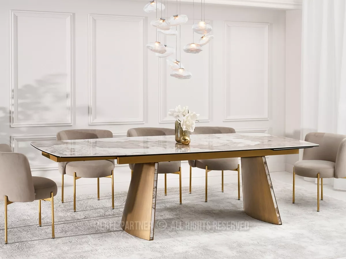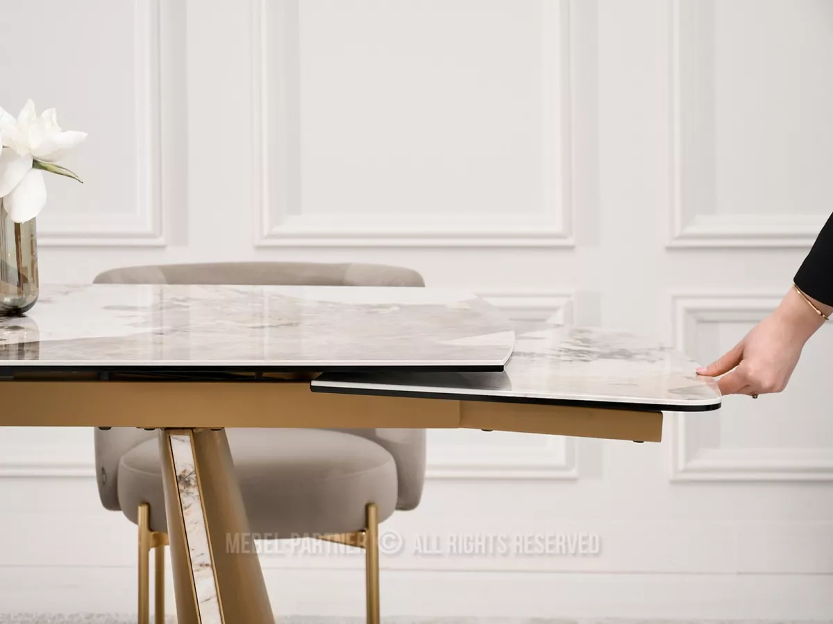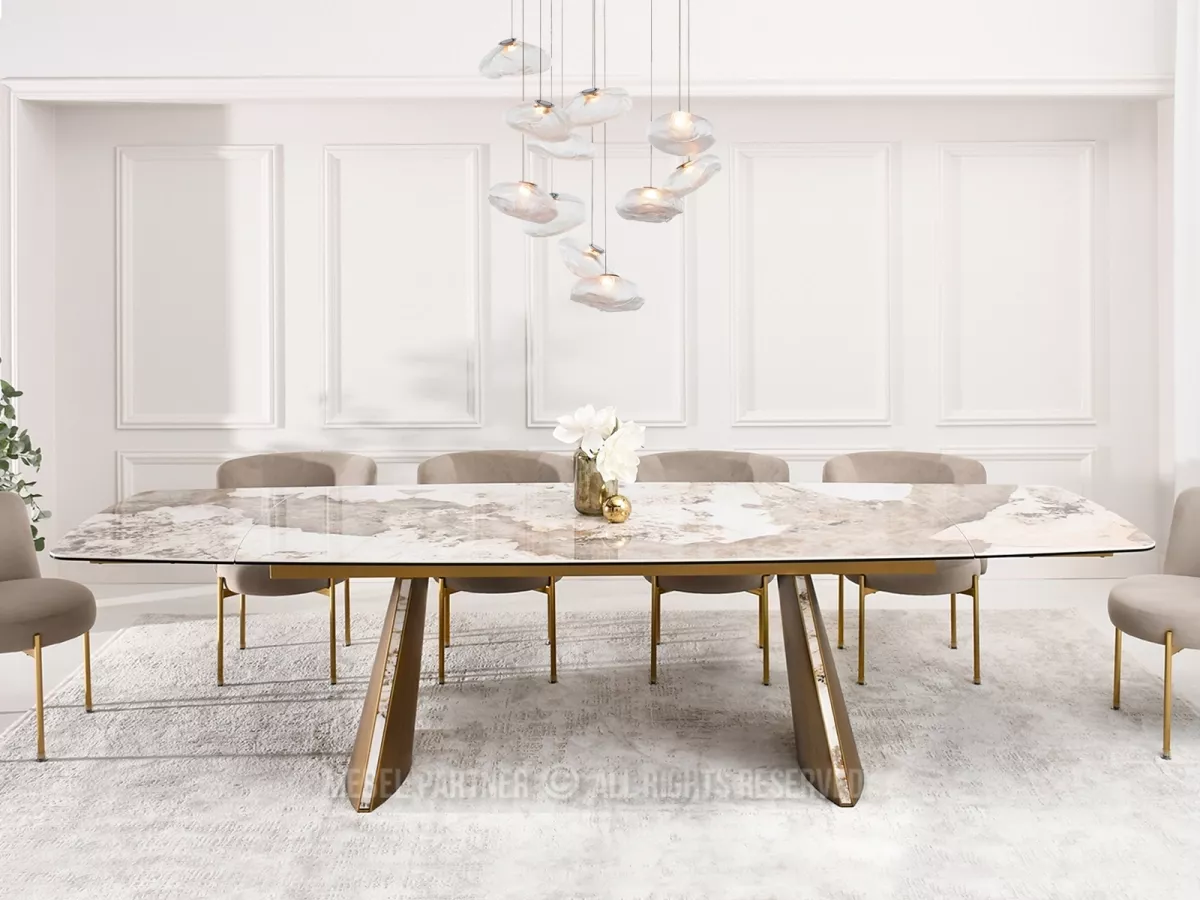 Rozkládací jídelní stůl GARRIS se vyznačuje především dekorem dřeva a mramoru. Stůl se stane hlavním bodem každé moderní jídelny nebo kuchyně a dodá jí nádech elegance a luxusu. Stůl disponuje rozkládací funkcí na šířku 300 cm a je tak vhodný až pro 12 osob.