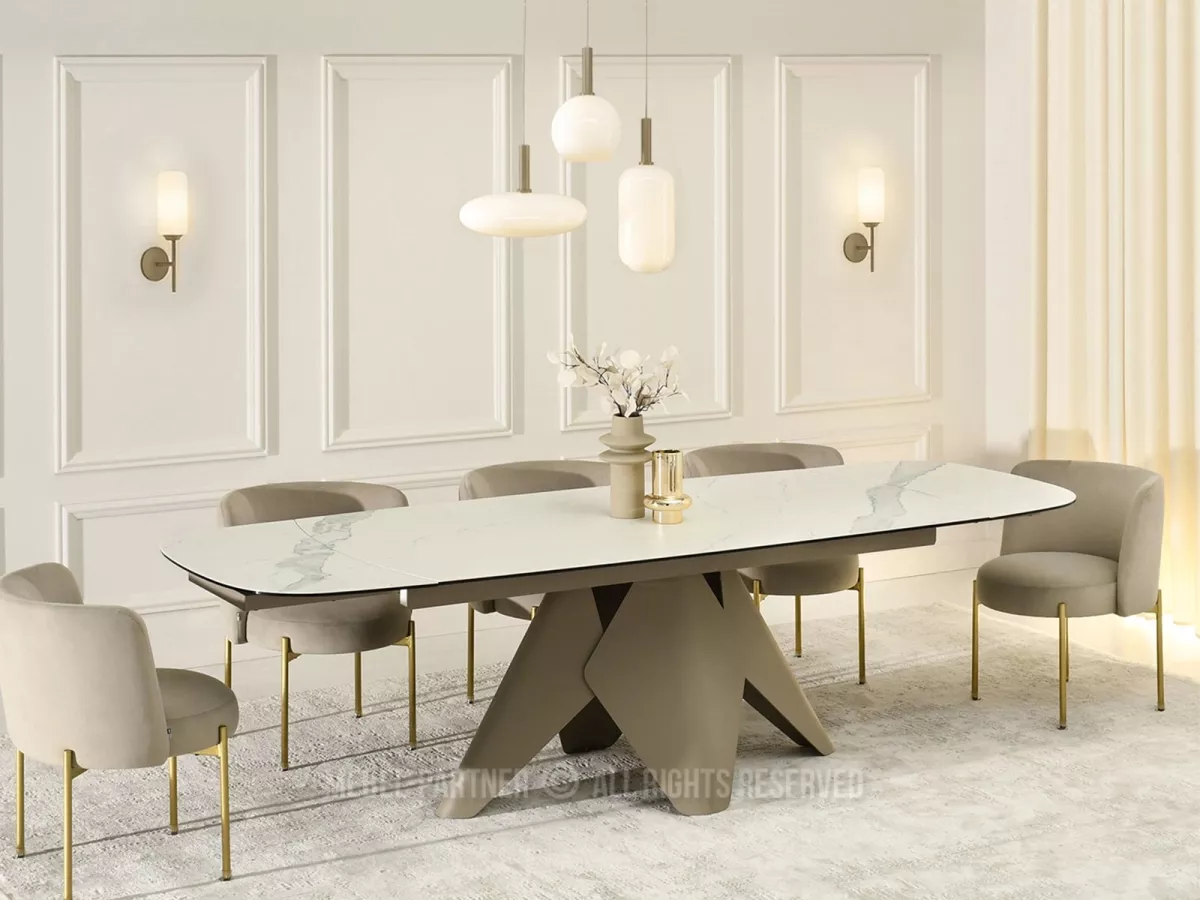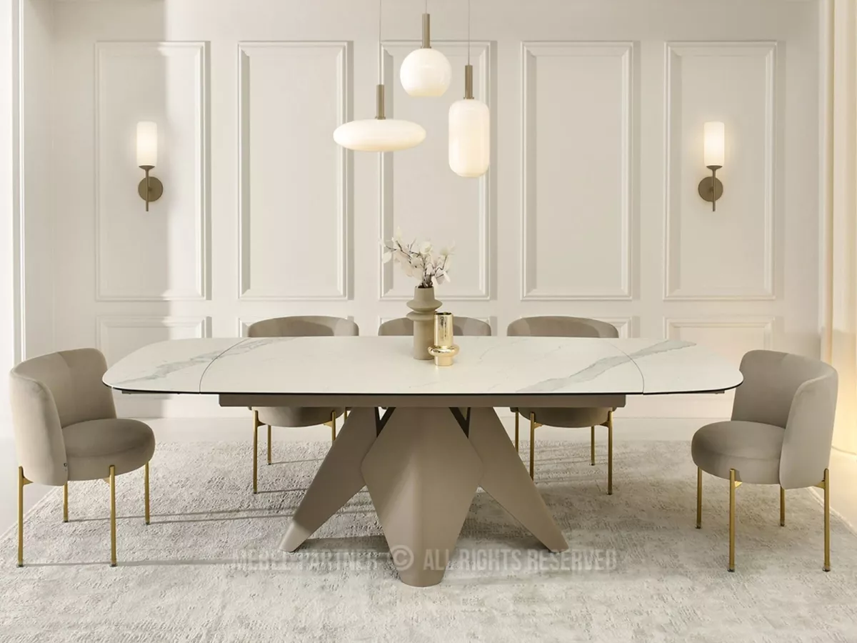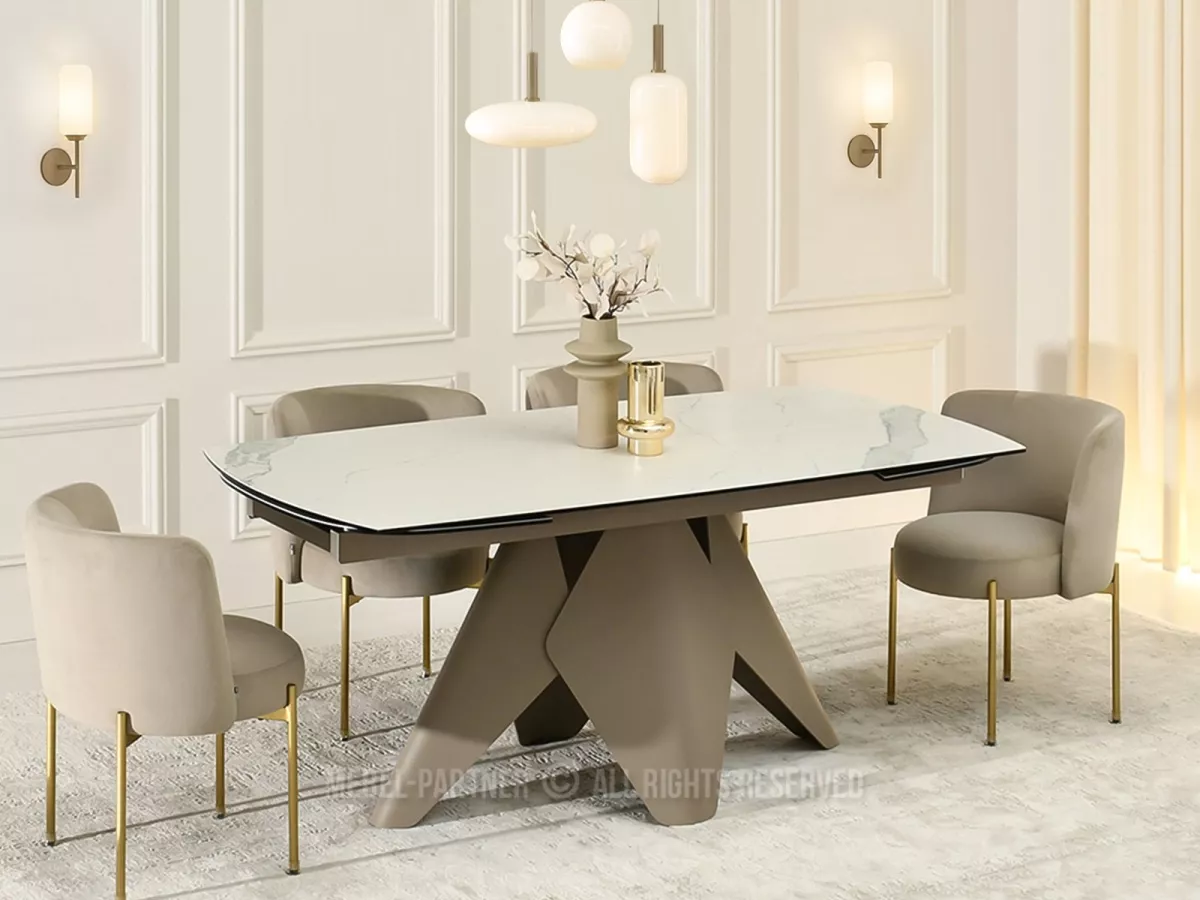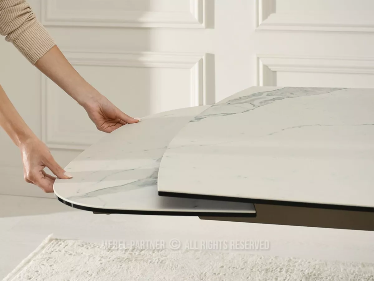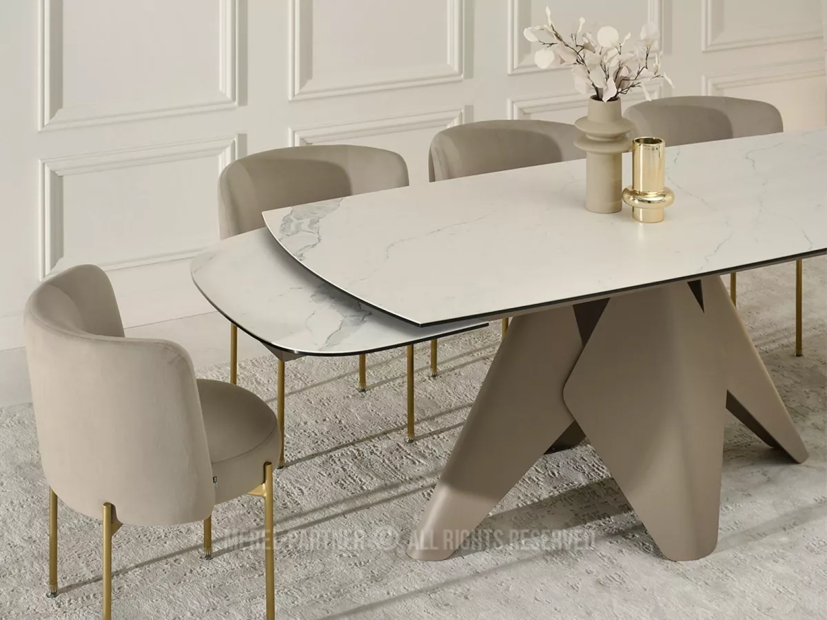 Rozkládací jídelní stůl HAMAD zaujme především mramorovanou horní deskou a výraznou kovovou podstavou. Skvěle se hodí do moderních, designových i industriálních interiérů a dodává jim luxus a eleganci.