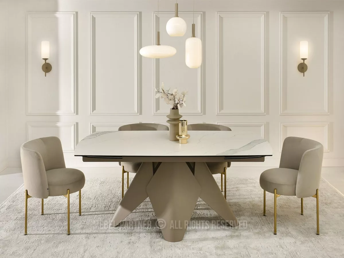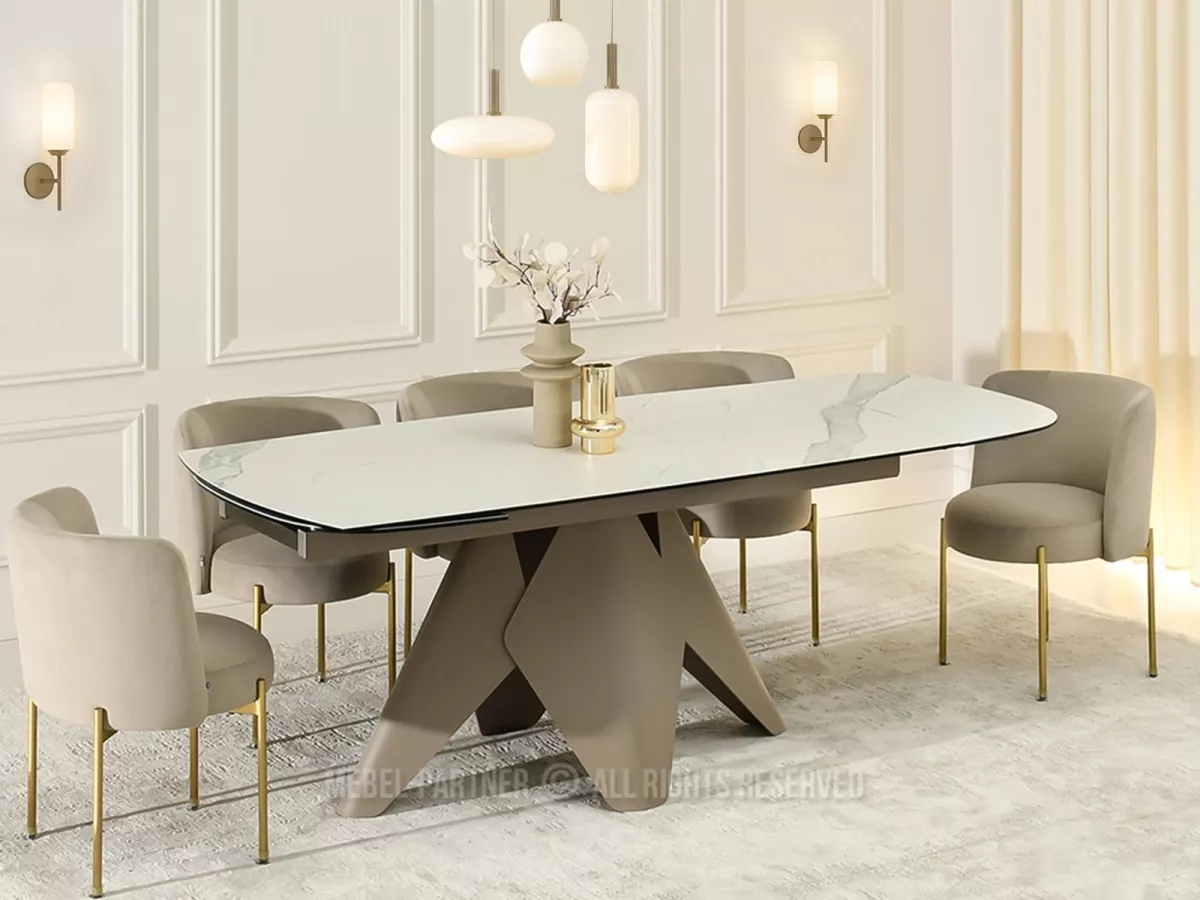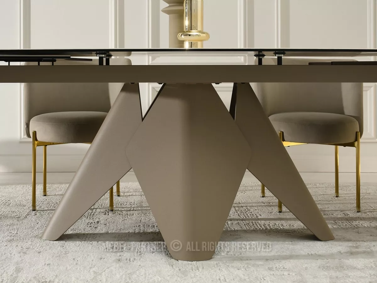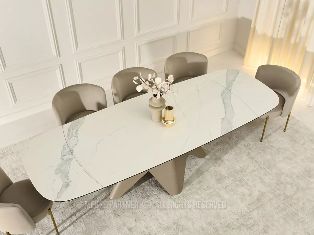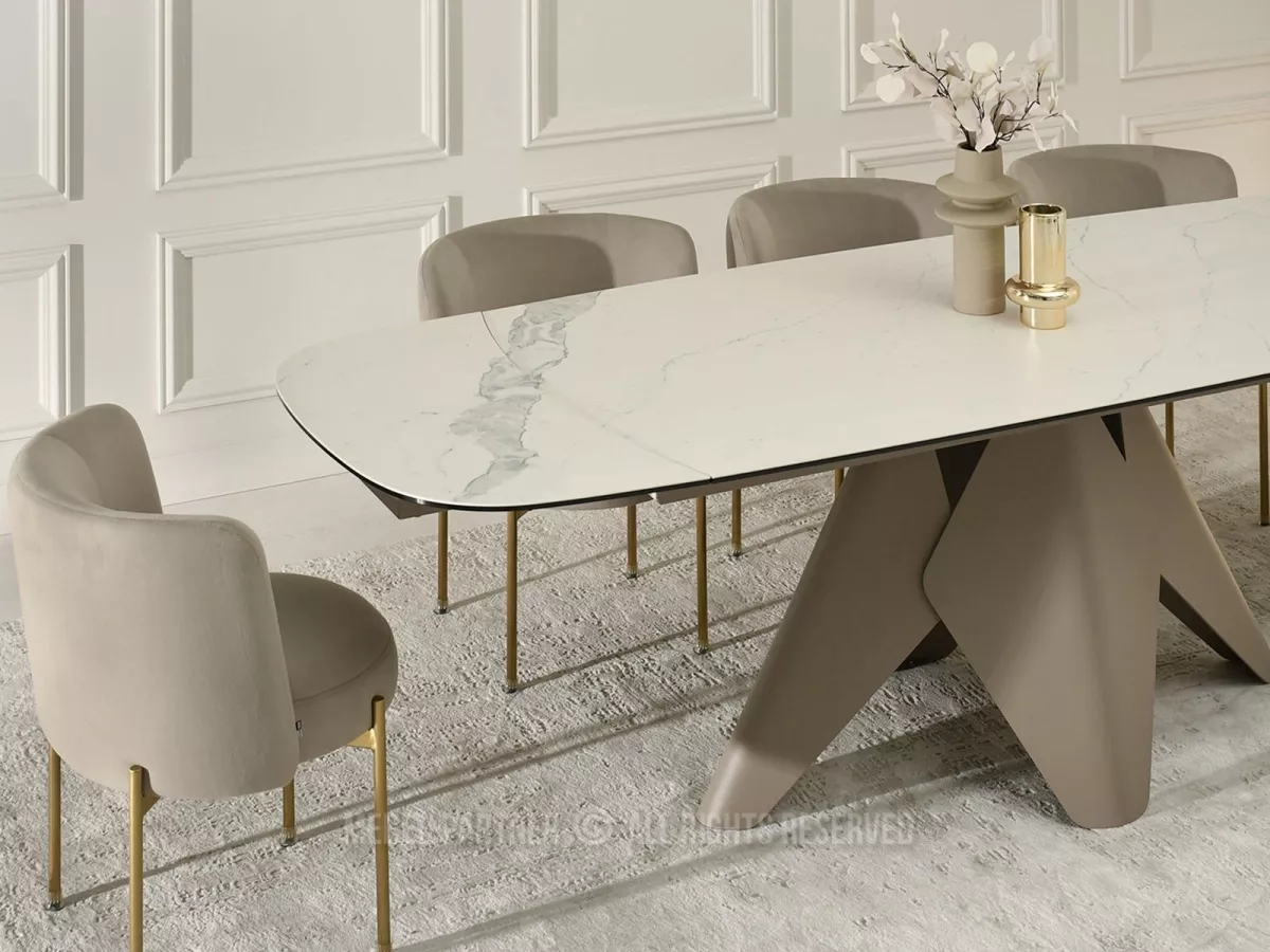Rozkládací jídelní stůl HAMAD zaujme především mramorovanou horní deskou a výraznou kovovou podstavou. Skvěle se hodí do moderních, designových i industriálních interiérů a dodává jim luxus a eleganci.