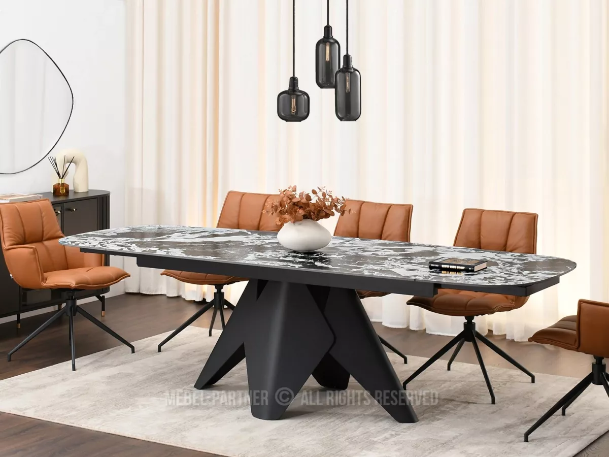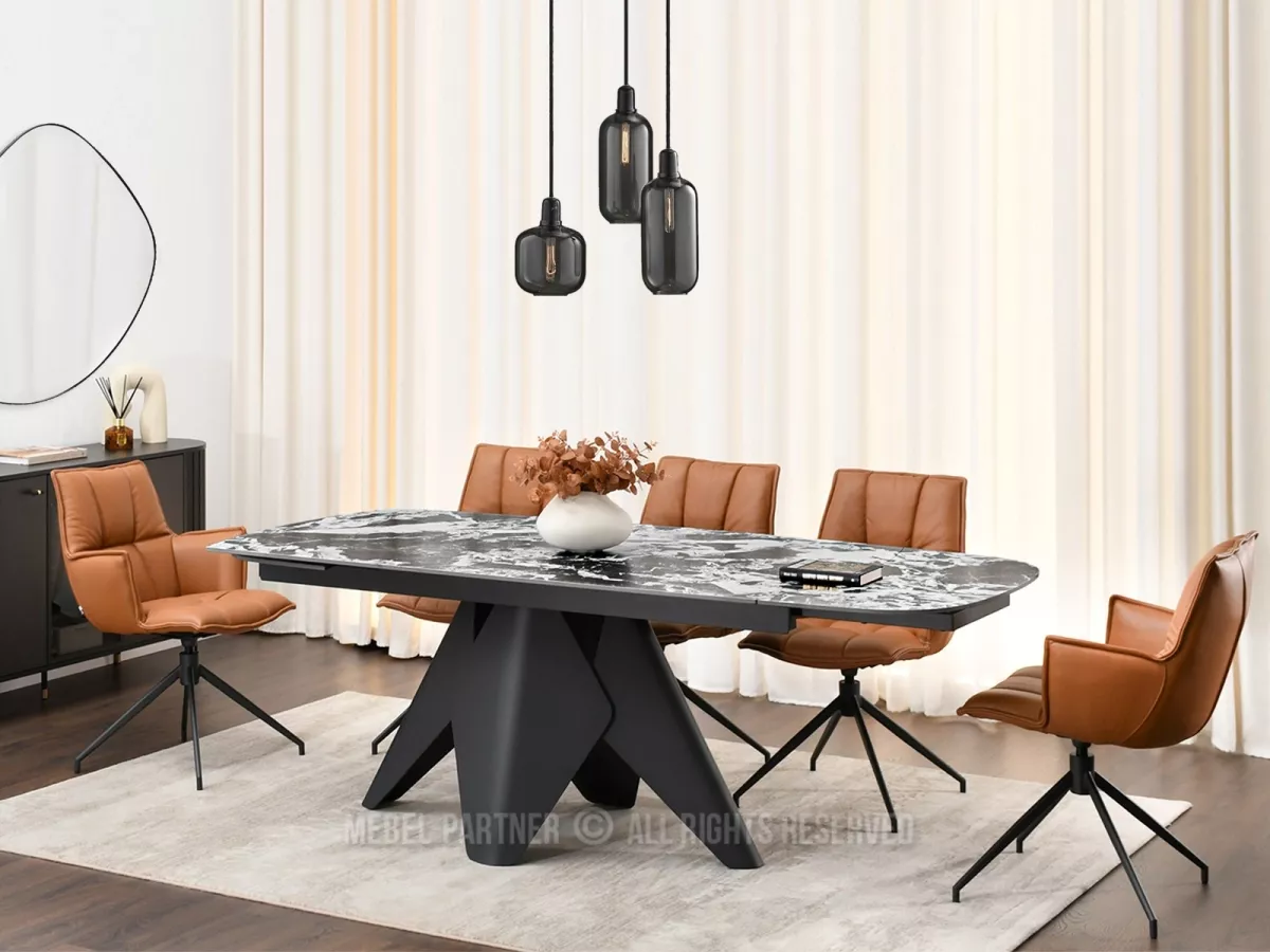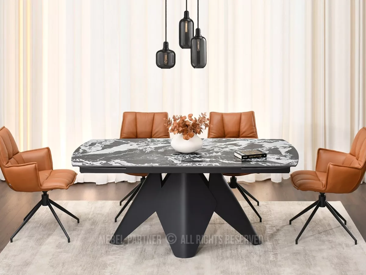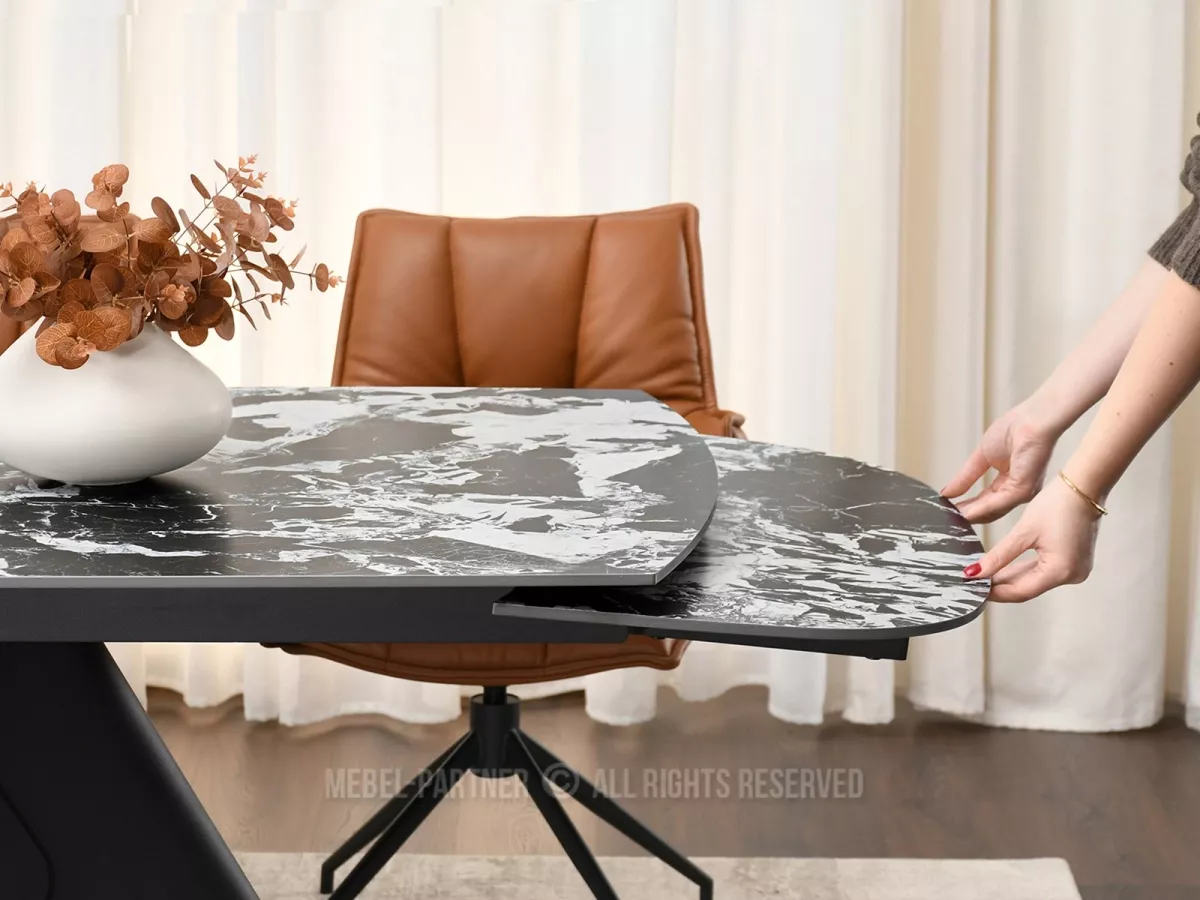 Rozkládací jídelní stůl HAMAD zaujme především mramorovanou horní deskou a výraznou kovovou podstavou. Skvěle se hodí do moderních, designových i industriálních interiérů a dodává jim luxus a eleganci.