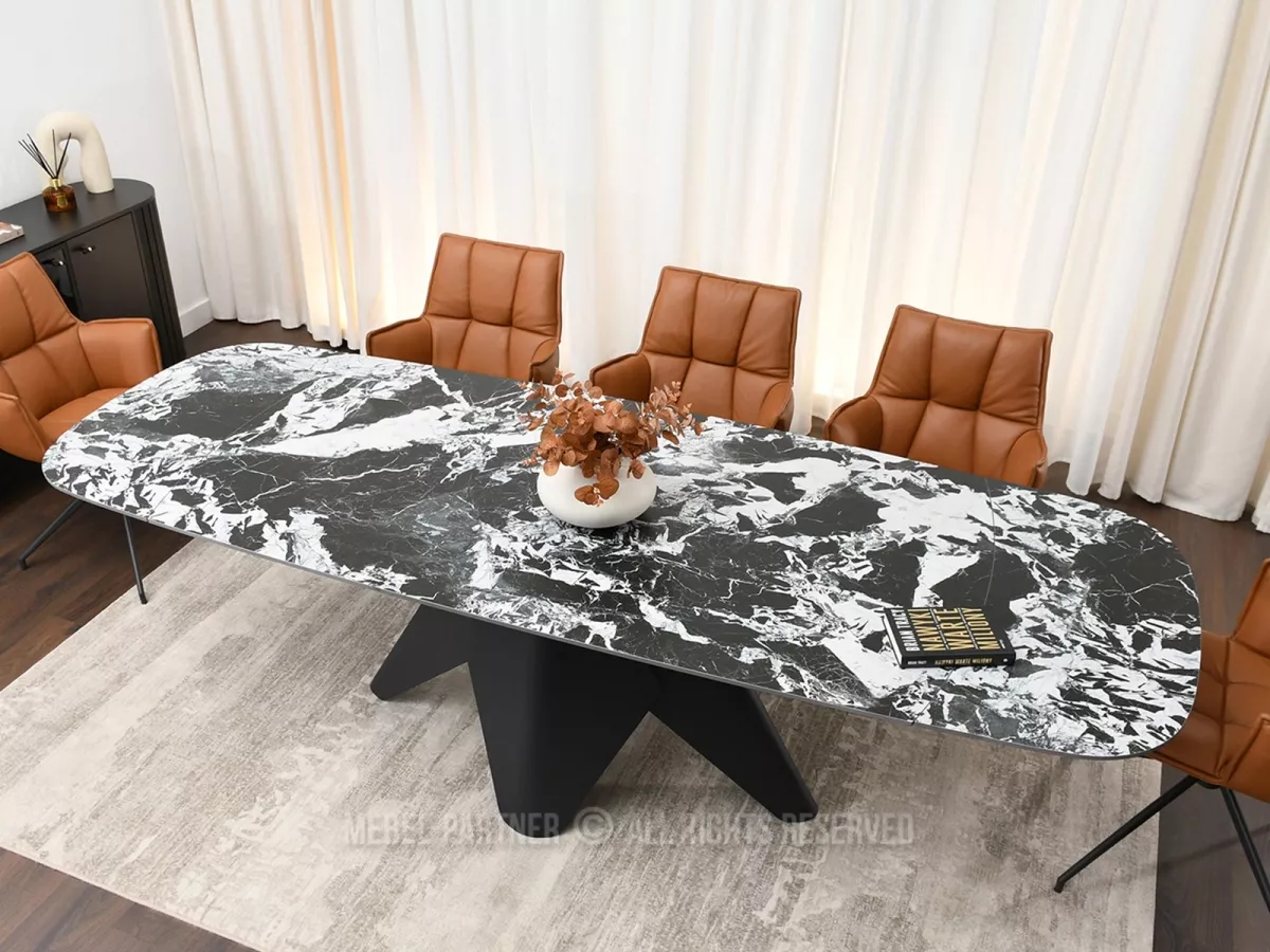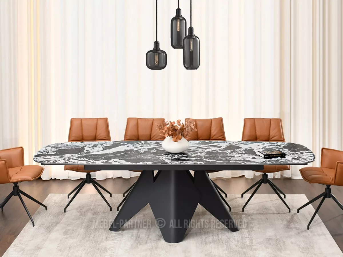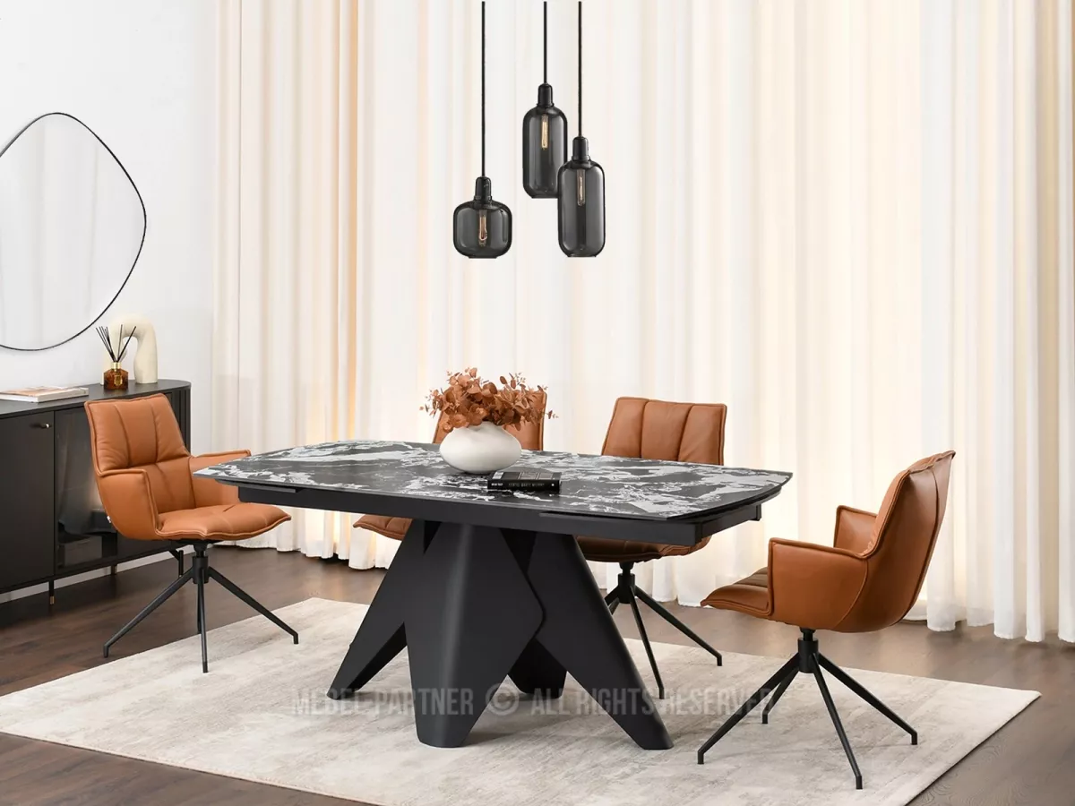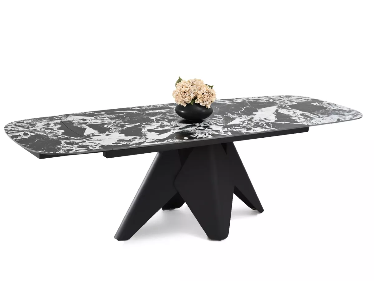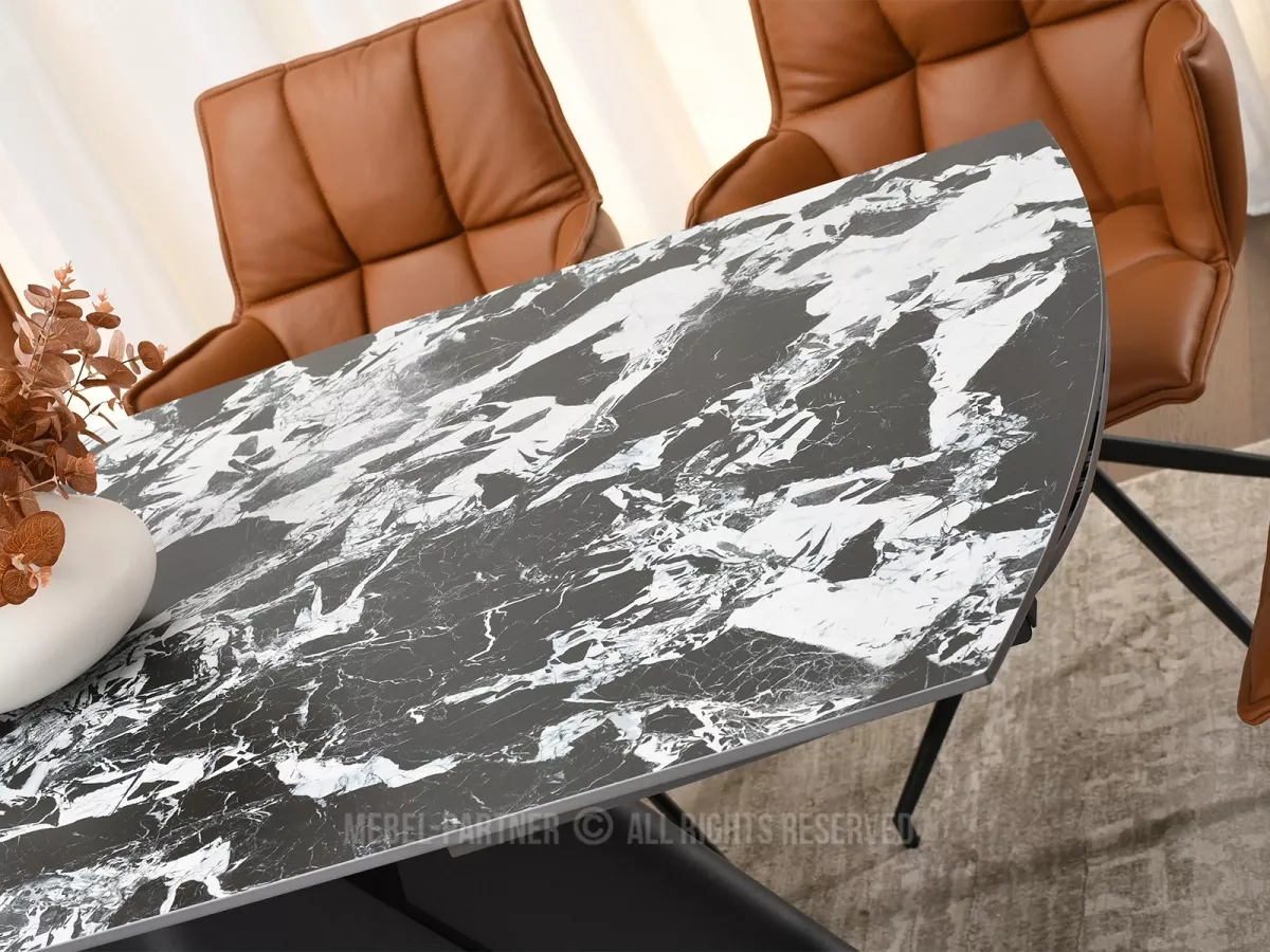 Rozkládací jídelní stůl HAMAD zaujme především mramorovanou horní deskou a výraznou kovovou podstavou. Skvěle se hodí do moderních, designových i industriálních interiérů a dodává jim luxus a eleganci.