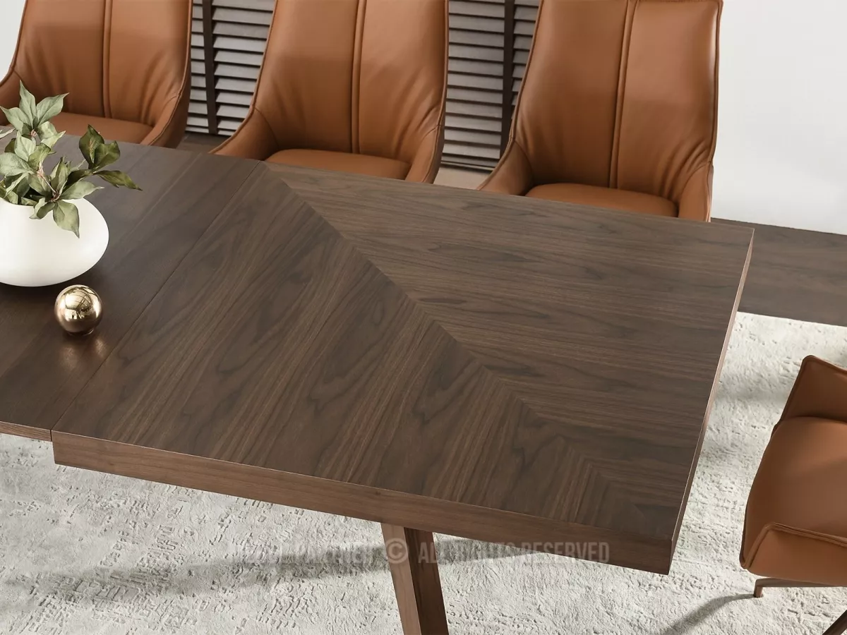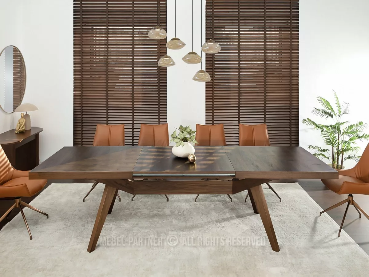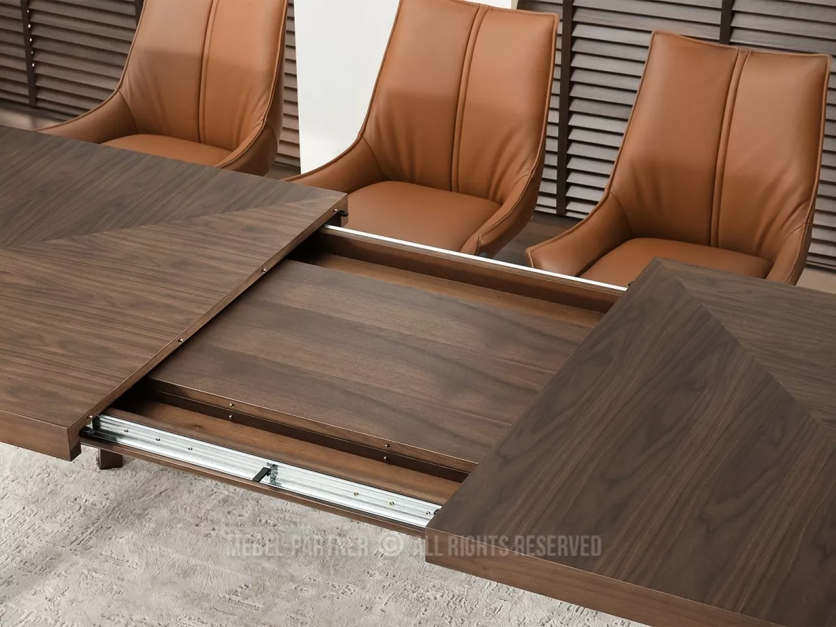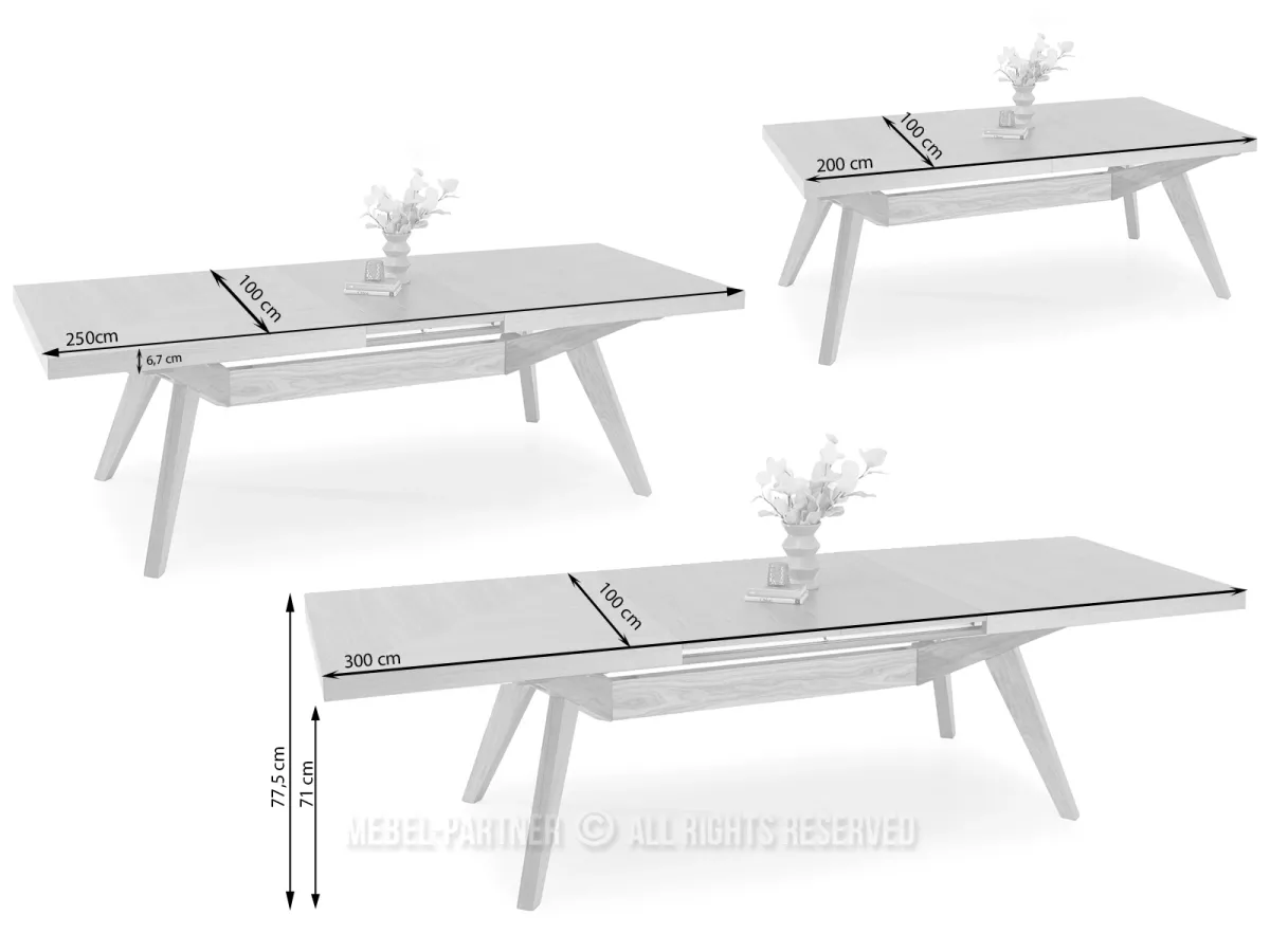 Rozkládací jídelní stůl KABUDAL je dokonalou kombinací moderního designu a praktičnosti. Je vybaven kovovou lištou, která umožňuje snadné vysouvání desek. Stůl je možné rozložit na šířku 250 cm nebo 300 cm.