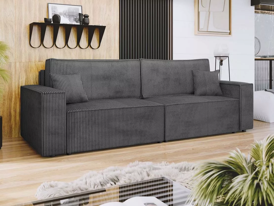 Pohovka KADRA vyniká moderním minimalistickým stylem, který dokonale ladí se současnými trendy. Nabízí 2 praktické úložné prostory na lůžkoviny, komfortní sedák a volně ložené opěrné polštáře pro maximální pohodlí. Funkce rozložení umožňuje snadnou přeměnu na prostorné lůžko o rozměrech 135x202 cm, ideální pro každodenní využití.