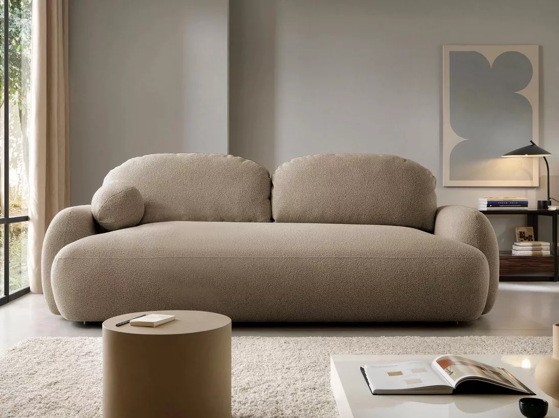 Rozkládací pohovka JACKI zaujme módními křivkami a módní čalouněnou látkou, která dodává pohovce jedinečný charakter. Součástí je kulatý dekorativní polštář pro maximální pohodlí při odpočinku. Praktická rozkládací funkce umožňuje snadno proměnit pohovku ve spací plochu o rozměrech 155×200 cm, ideální pro každodenní spánek i občasné přenocování.