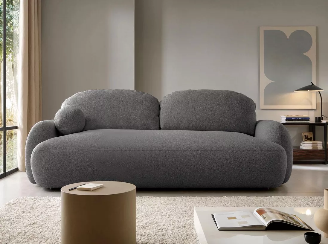 Rozkládací pohovka JACKI zaujme módními křivkami a módní čalouněnou látkou, která dodává pohovce jedinečný charakter. Součástí je kulatý dekorativní polštář pro maximální pohodlí při odpočinku. Praktická rozkládací funkce umožňuje snadno proměnit pohovku ve spací plochu o rozměrech 155×200 cm, ideální pro každodenní spánek i občasné přenocování.