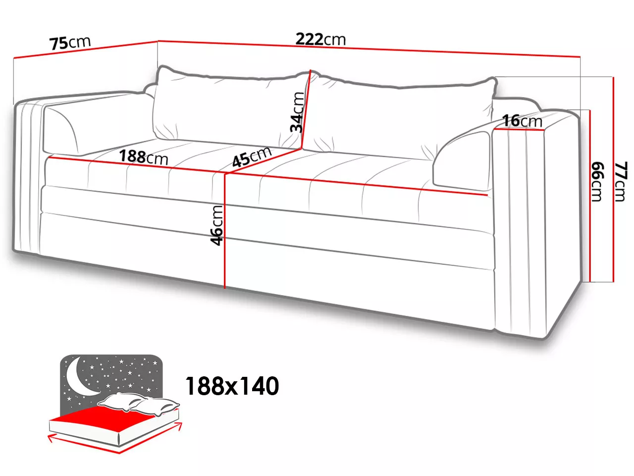 - ložná plocha: 140x188 cm