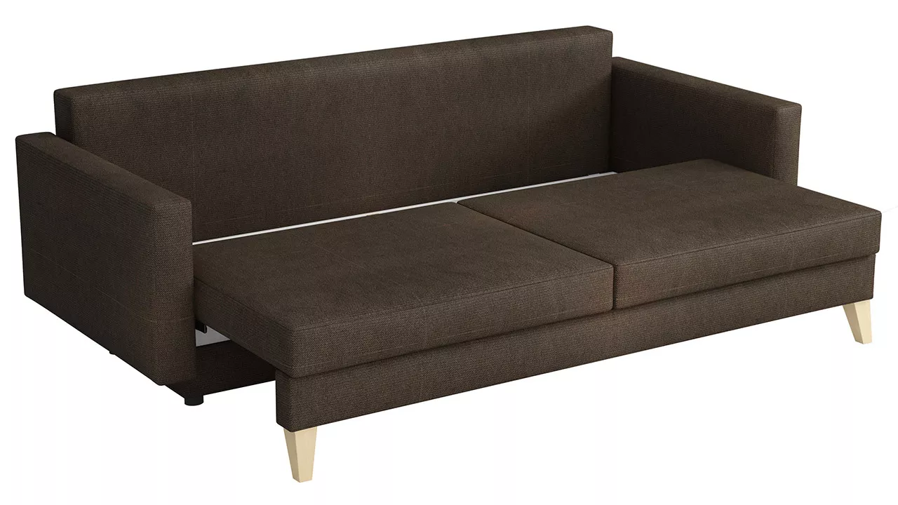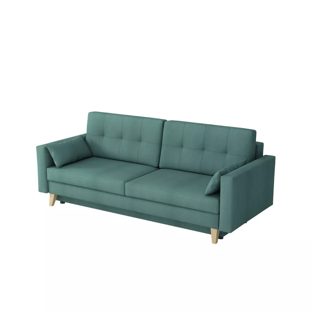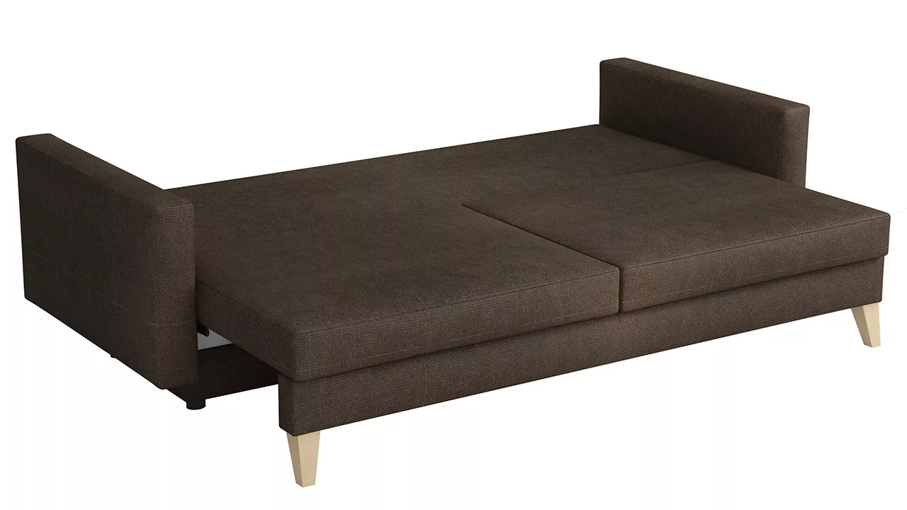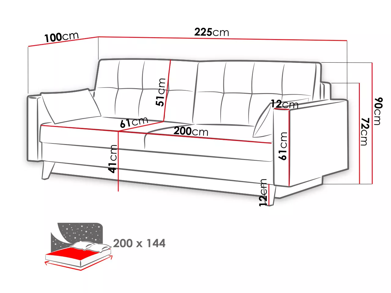 Trojmístná rozkládací pohovka LAZAROK zaujme svou elegancí a skvěle zapadne do moderního interiéru. Dokonalé prošití opěradla a vysoké dřevěné nohy podtrhují její půvab. Dva malé polštářky jsou ozdobným detailem. Navíc ji lze rozložit na komfortní lůžko o spacím prostoru 144x200 cm. V pohovce se nachází praktický úložný prostor na ložní prádlo, který může sloužit také jako místo pro sezónní oblečení. Zadní část pohovky je čalouněná látkou, což umožňuje její umístění kdekoli v místnosti.