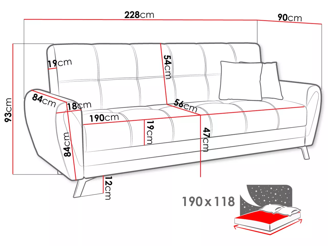 - ložná plocha: 118x190 cm
