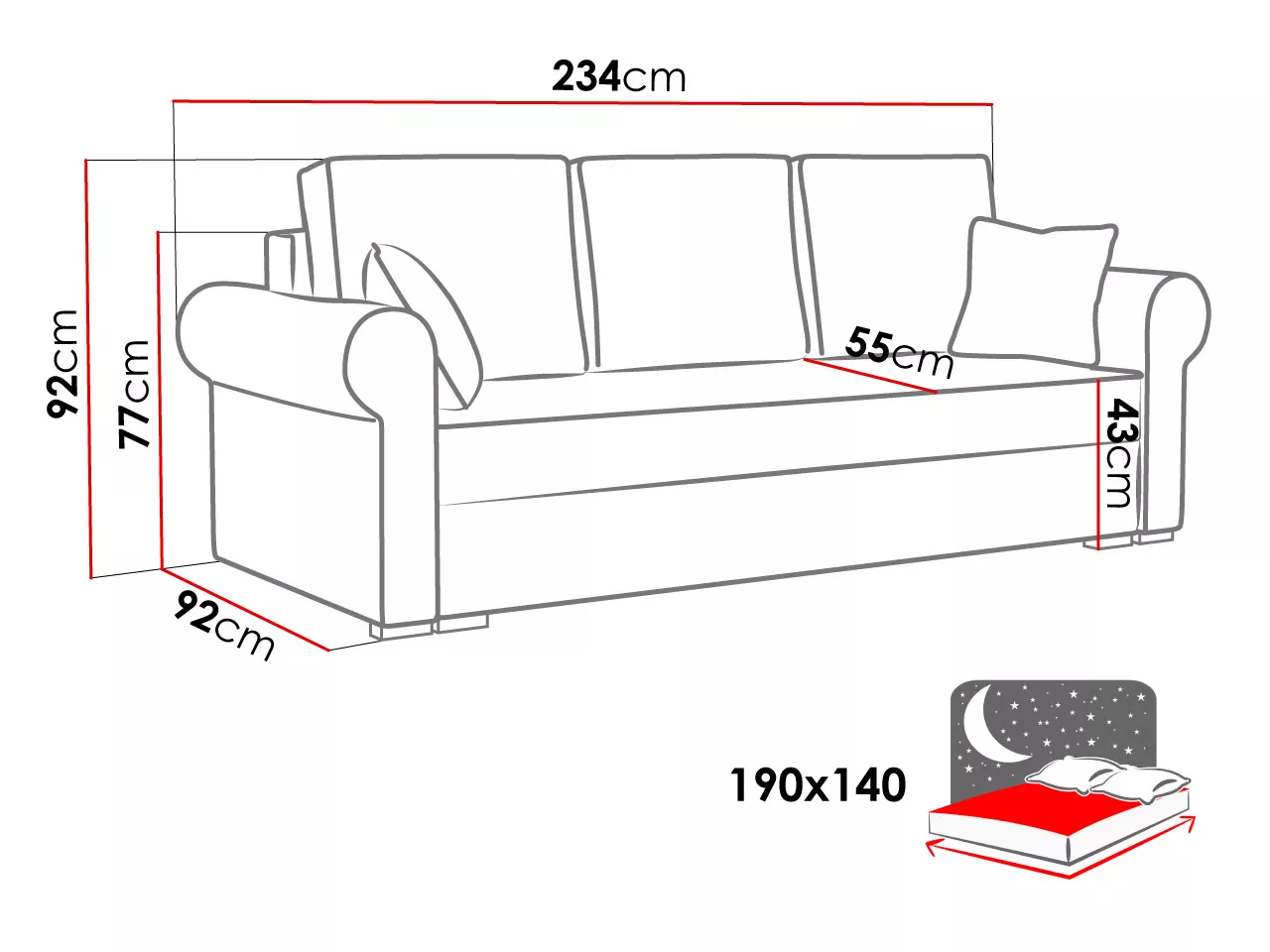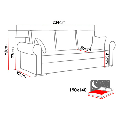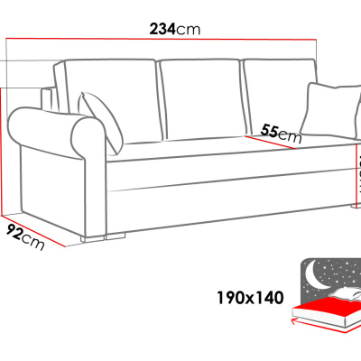 Trojmístná pohovka na každodenní spaní MECOCAL nabízí spací lůžko o rozměrech 140x190 cm. Nechybí ani praktický úložný prostor na lůžkoviny. Opěradlo tvoří volně ložné měkké polštáře, které zaručují vysoký komfort pro vaše záda.