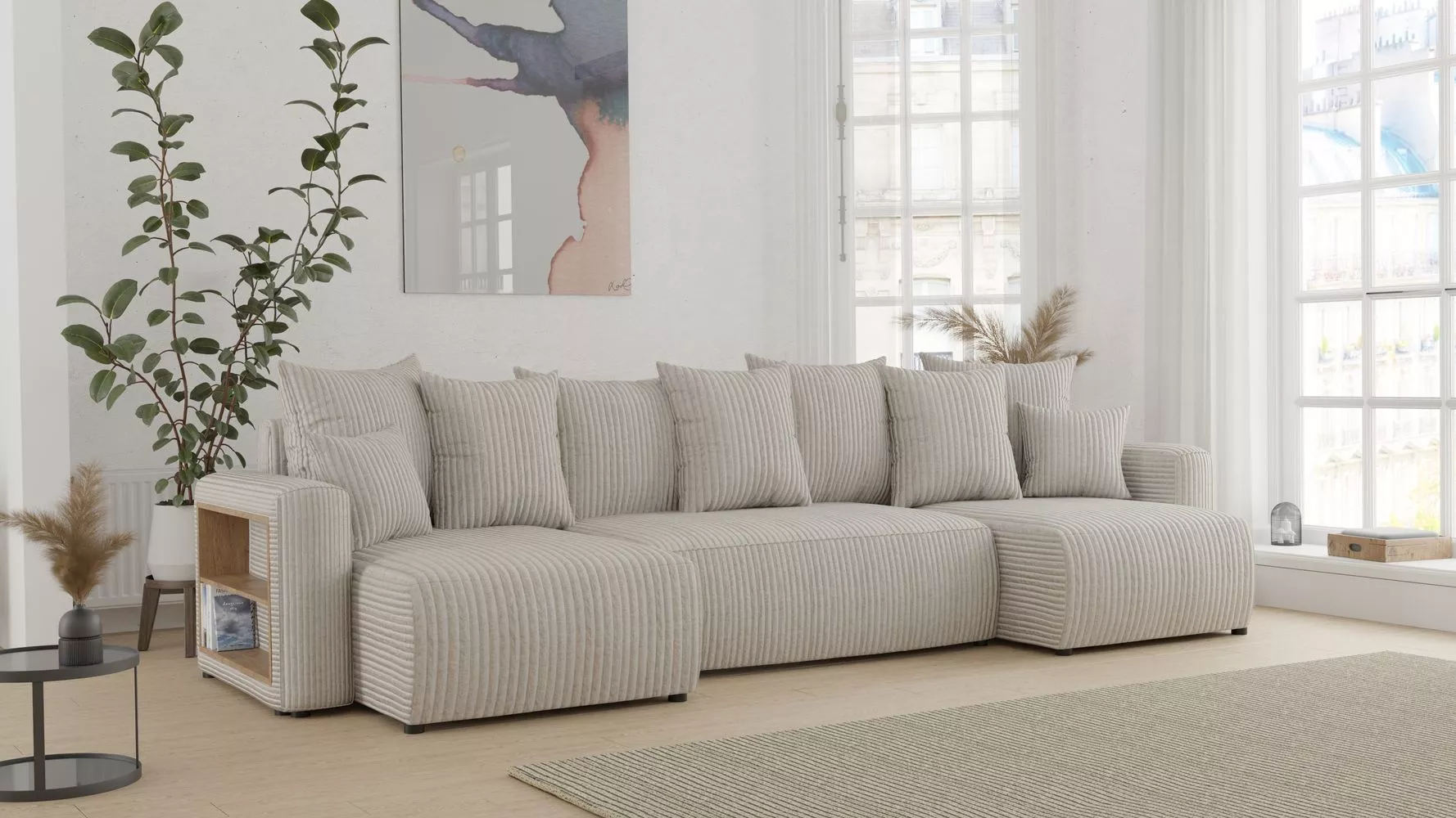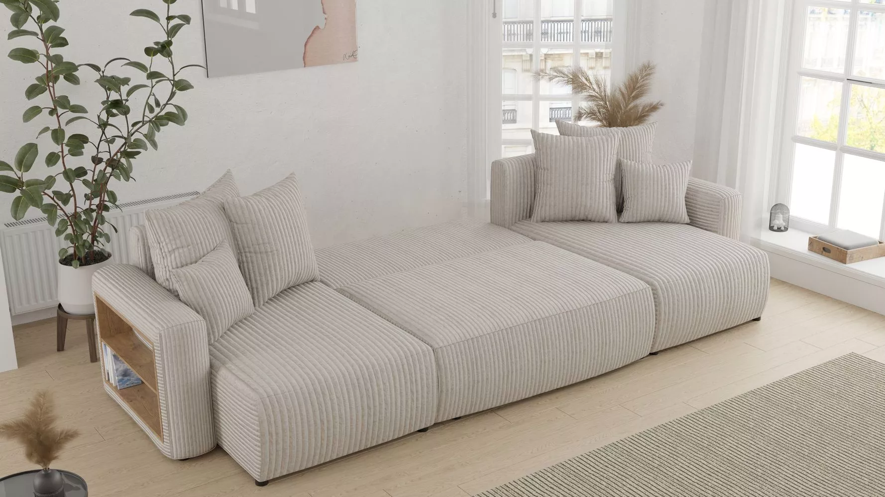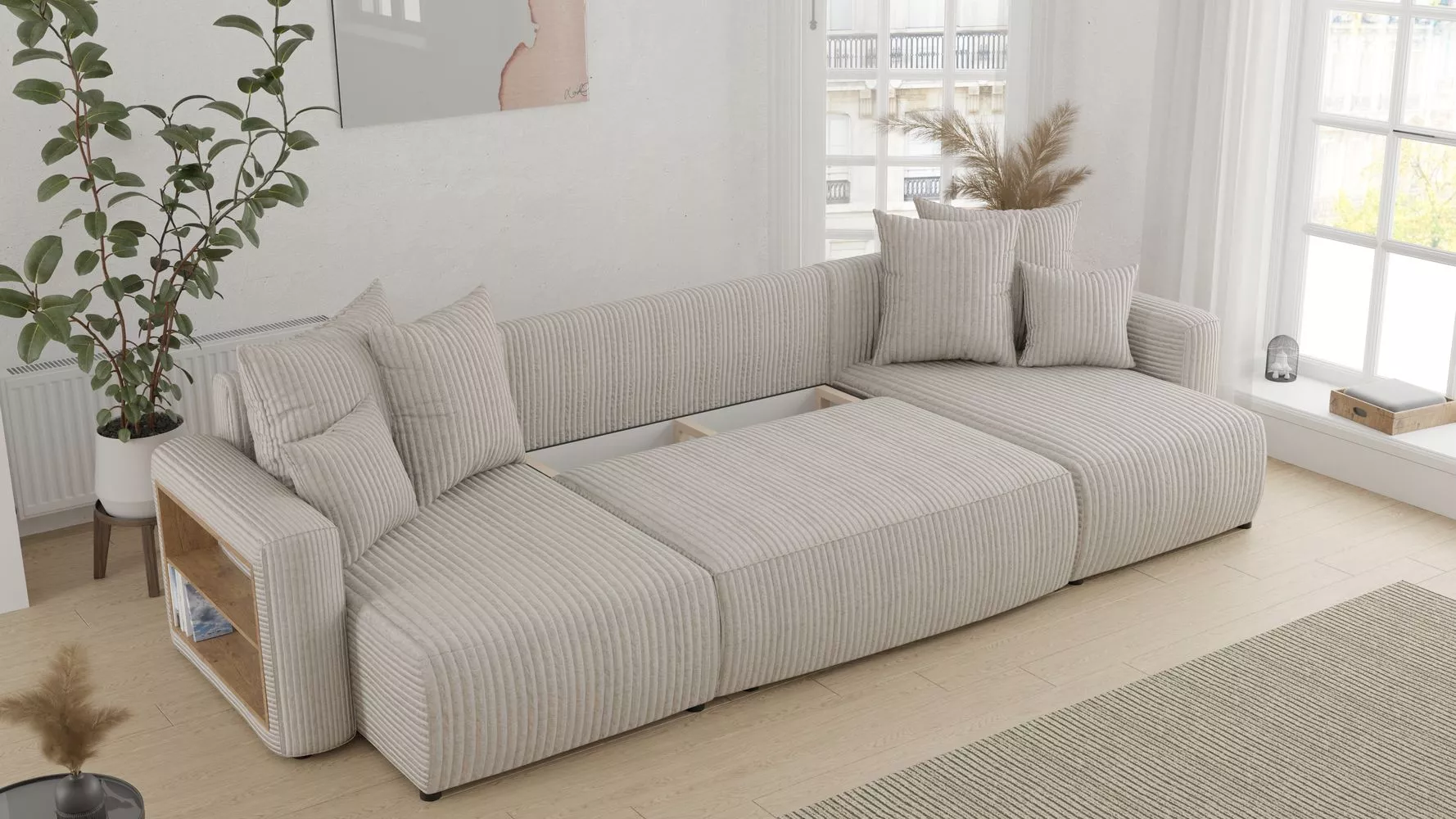 Sedací souprava do U KIANA nabízí úložný prostor pod sedací částí a také v boční loketní opěrce. Nechybí ani rozkládací funkce a možnost každodenního spaní.