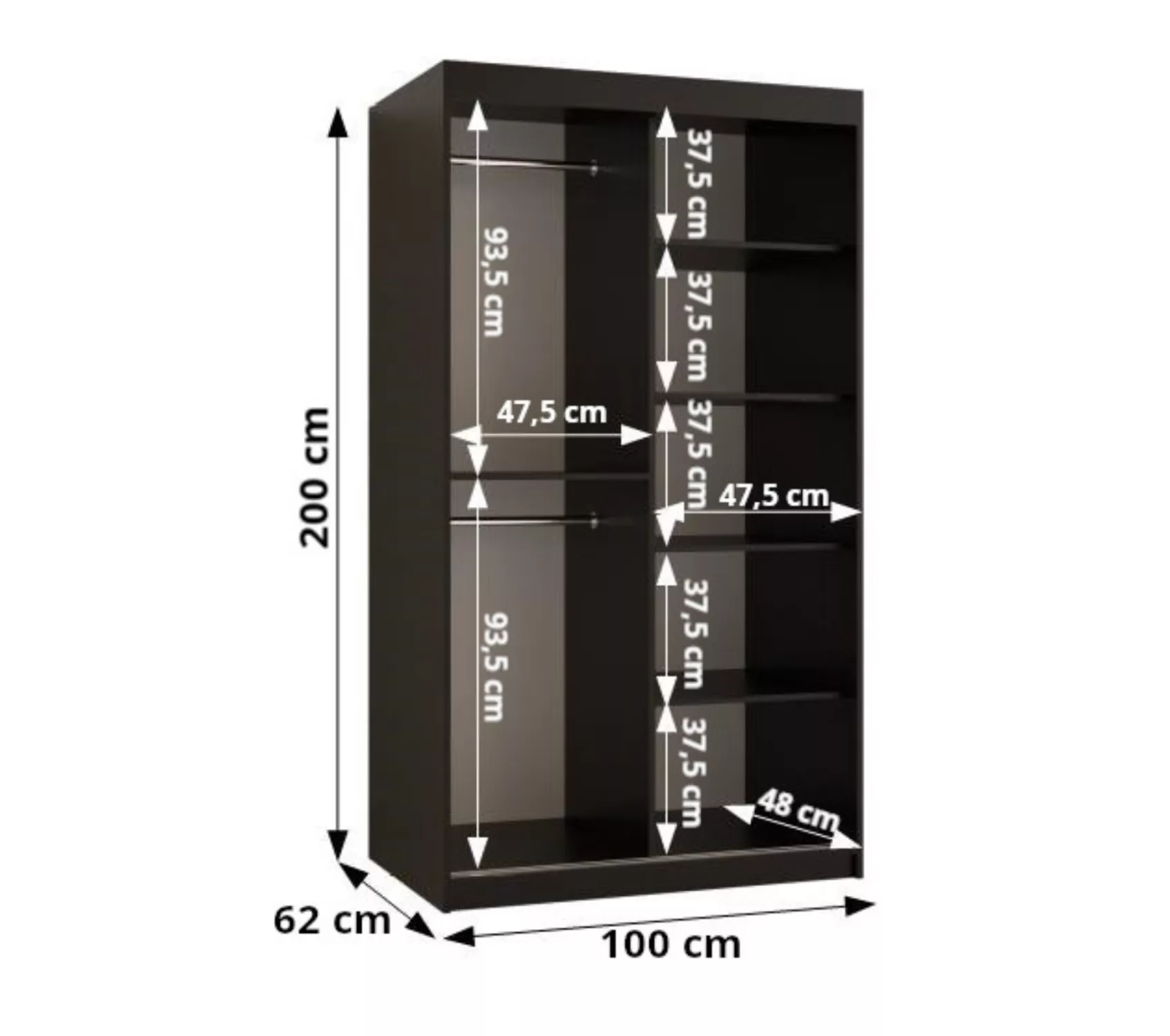 Šatní skříň s posuvnými dveřmi 100 cm CASANDRA díky svému jednoduchému designu zapadne do všech ložnic. Skříň disponuje 2 šatními tyčemi a 5 prostornými policemi. Je vyrobená z odolných materiálů, díky čemuž vám bude sloužit mnoho let.